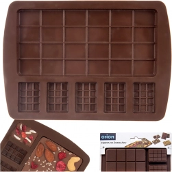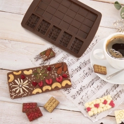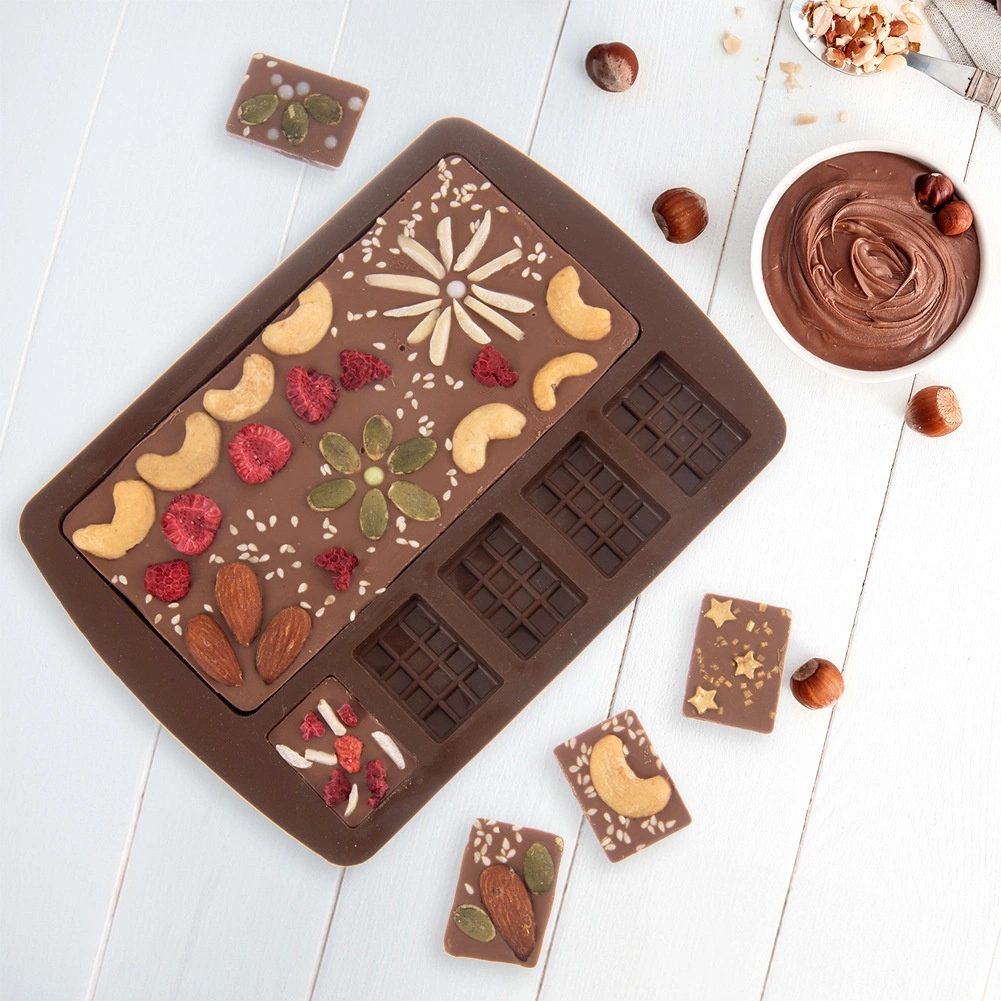 S ovim univerzalnim kalupom od kvalitetnog silikona pripremit ćete efektne pločice i mini praline s orašastim plodovima, sušenim voćem ili keksima. Fleksibilan materijal je čvrst, izdržljiv i ne lijepi se, pa ćete gotove komade izvaditi bez oštećenja. Kalup ima ukupne dimenzije 18,5 × 13,5 × 1,5 cm.