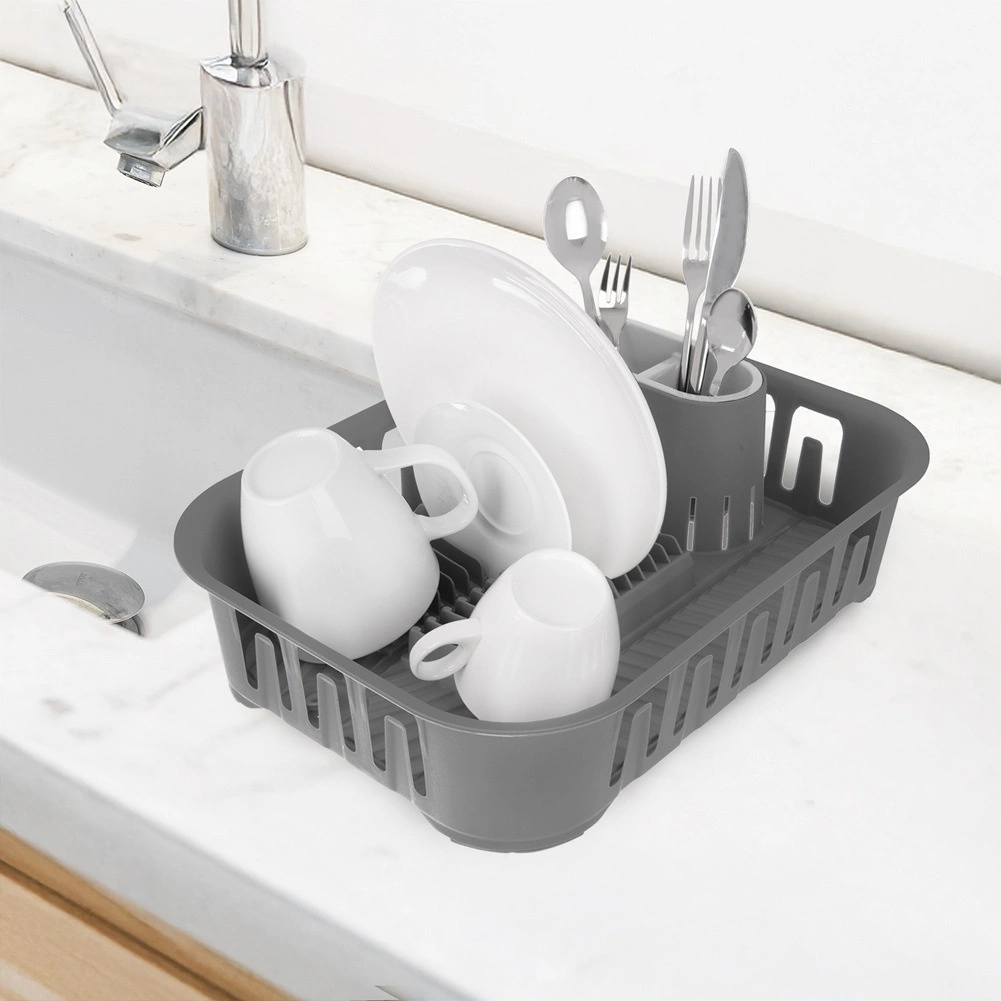 Pametno ocjedalo za posuđe u elegantnoj sivoj boji olakšava sušenje opranih tanjura, šalica i pribora za jelo, a ujedno štiti kuhinjsku plohu od vode. Ima promišljeno dno s integriranim odvodom i čepom, pa nije potreban dodatni pladanj. Dio seta je izvadiva kutija za pribor za jelo s dvije komore za praktično razvrstavanje.