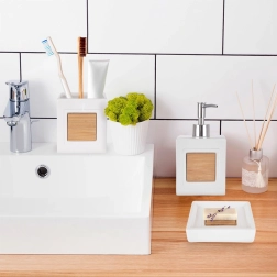 Elegantni 3-dijelni kupaonski set u bijeloj boji kombinira izdržljiv dolomit i prirodni bambus. Sadrži dozator sapuna 350 ml, kupaonsku čašu 330 ml i posudicu za sapun. Minimalistički dizajn, jednostavno održavanje i univerzalan stil za moderne i klasične kupaonice.