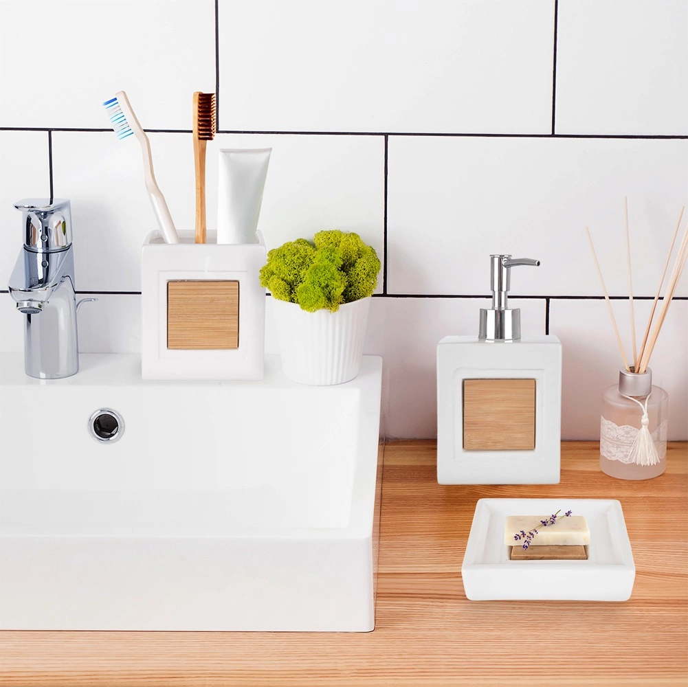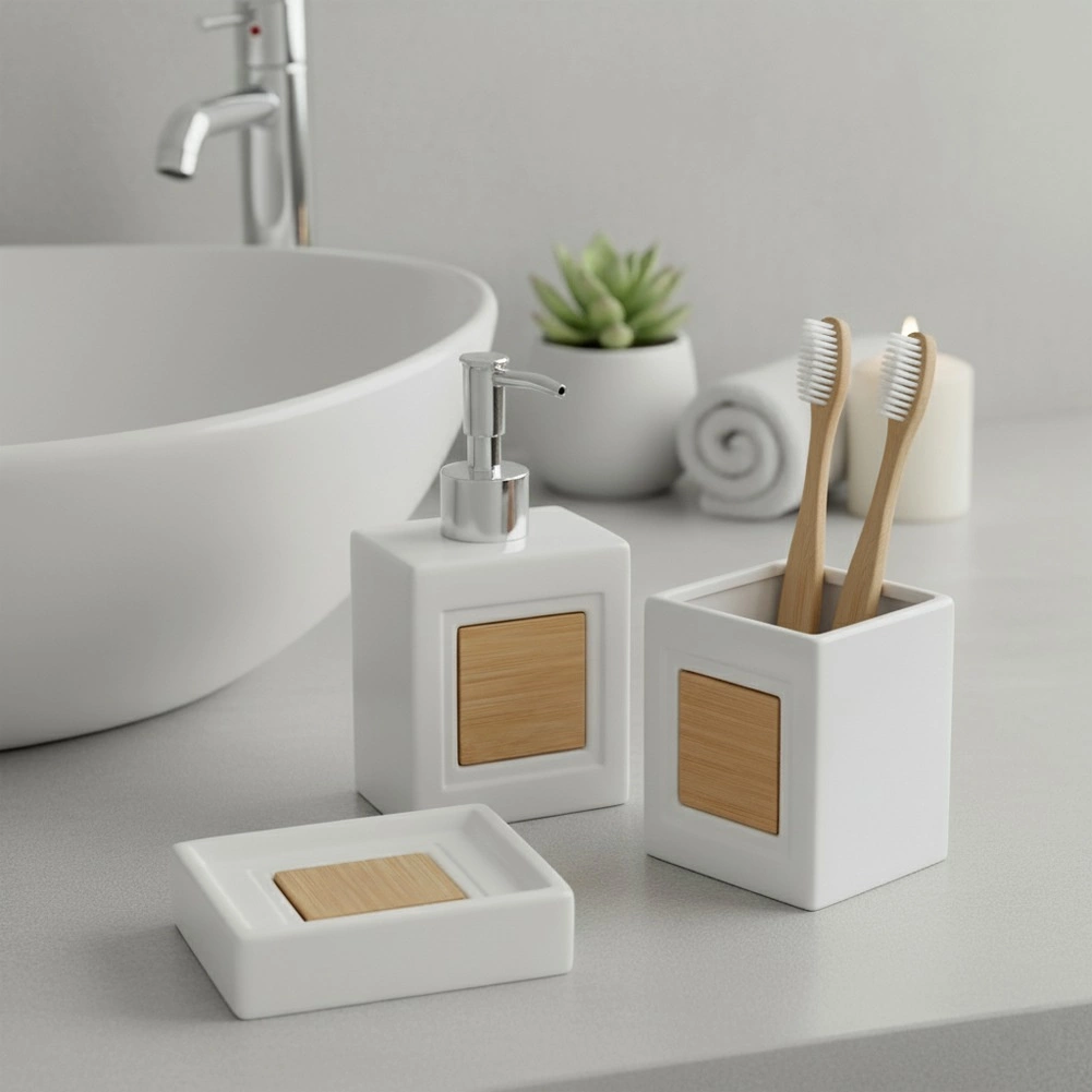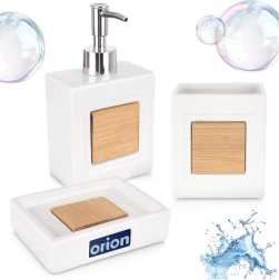 Set uključuje dozator za tekući sapun s preciznim doziranjem, čašu za četkice ili kozmetičke dodatke te posudicu za sapun za higijensko odlaganje čvrste sapunske kocke. Idealno za kupaonicu i toalet – pomaže održati red i elegantan izgled.