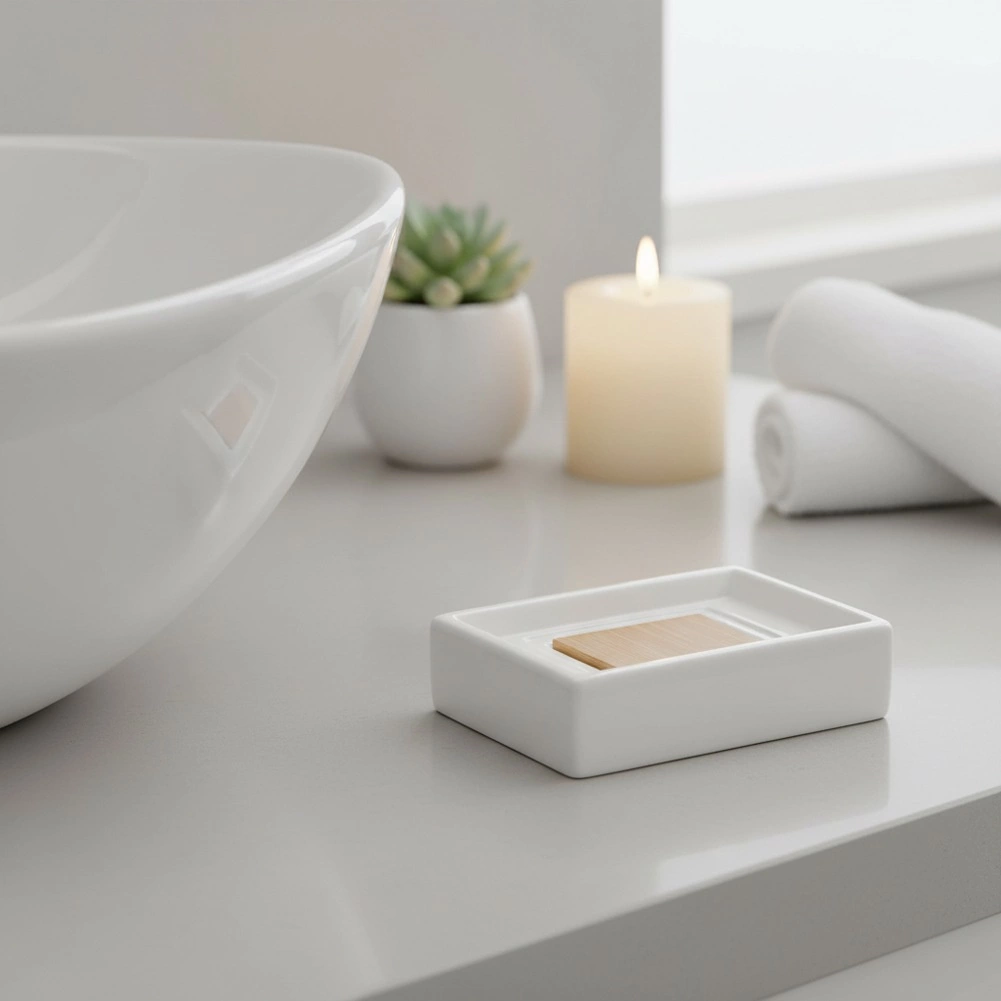 Minimalistički bijeli dizajn odlično se uklapa u različite stilove interijera, a njezina glatka površina lako se čisti. Dimenzije 11 × 8 × 3 cm štede prostor na umivaoniku, a istodobno pružaju dovoljno mjesta za uobičajeni čvrsti sapun.