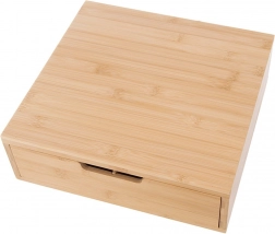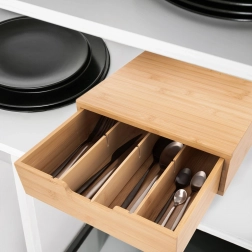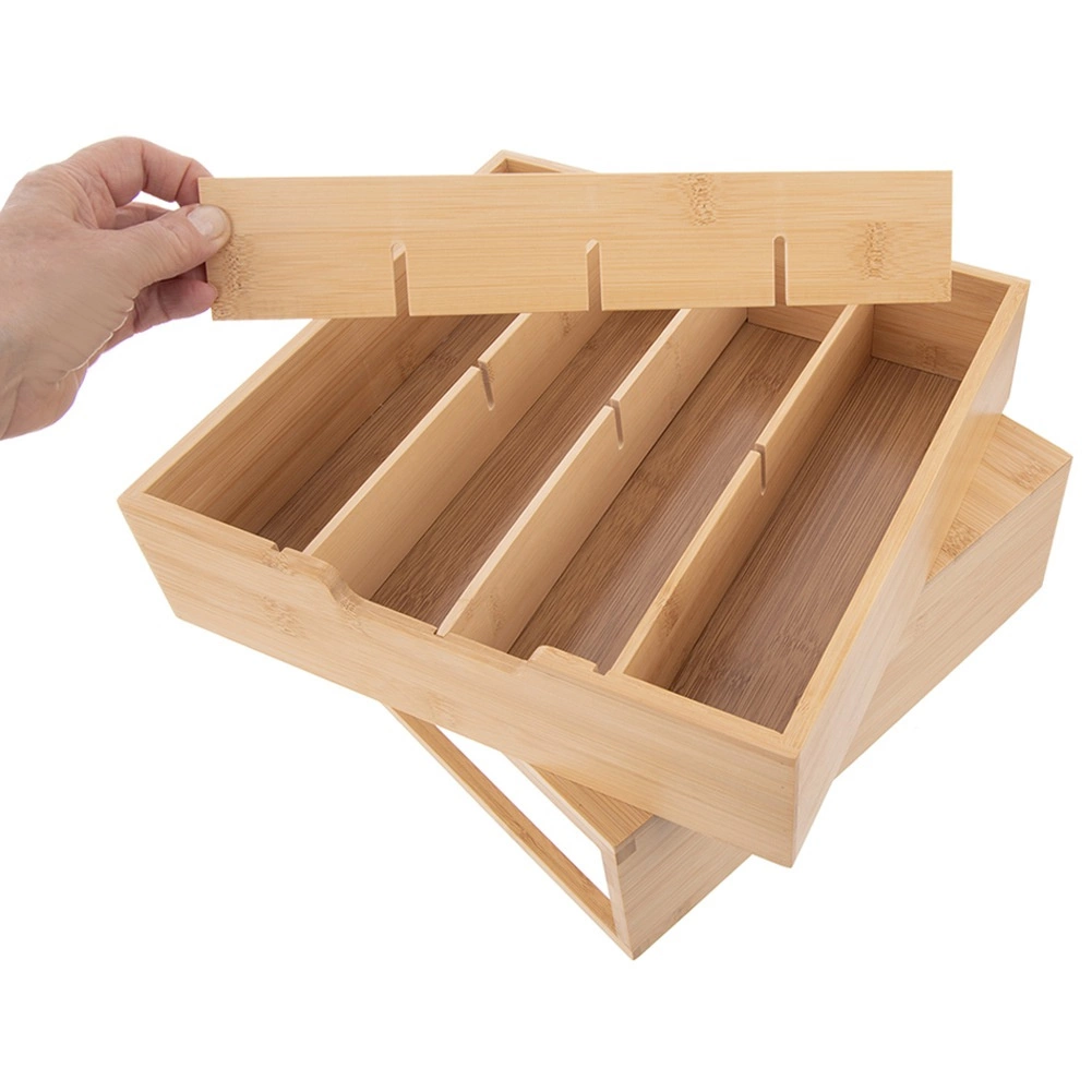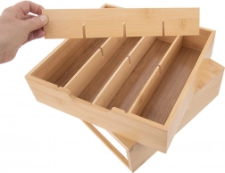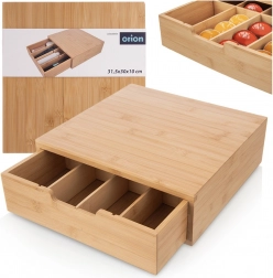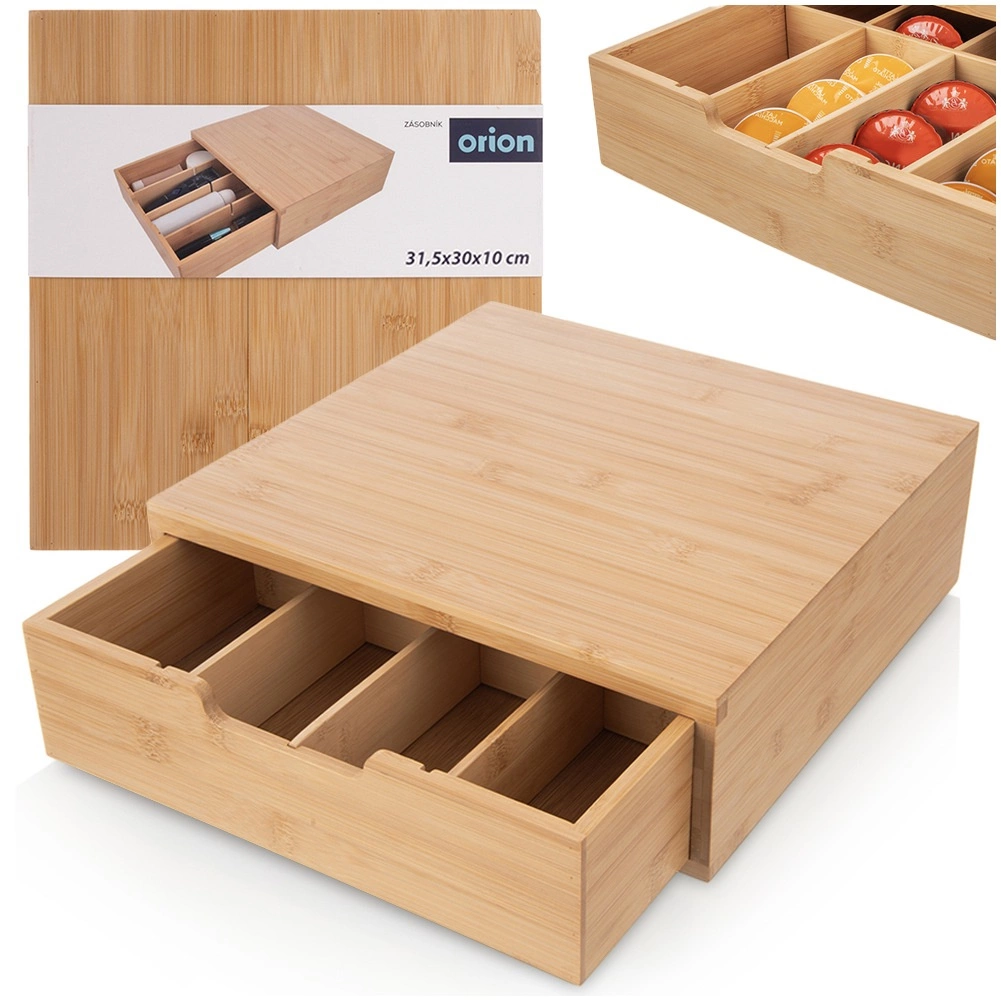 Elegantni organizator od prirodnog bambusa spaja stilski izgled i funkcionalnu organizaciju. Ladica s pregradama omogućuje pregledno razvrstavanje kapsula, vrećica čaja, začina i drugih sitnica. Prilagodite unutarnji raspored pomoću izmjenjivih elemenata točno prema svojim potrebama.