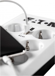 EATON Protection Box 6 USB je vrhunski prenaponski produžni razdjelnik dizajniran za zaštitu računala, TV-a, Hi‑Fi sustava, igraćih konzola, mrežne opreme i druge osjetljive elektronike. Zahvaljujući naprednoj konstrukciji koja ispunjava normu IEC 61643-11, učinkovito filtrira naponske vršne vrijednosti, smetnje i neizravne učinke munje. Stanje zaštite imate pod kontrolom zahvaljujući indikatoru Protection OK.