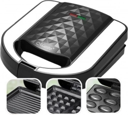 U pakiranju se nalazi grill ploča, ploča za vafle i ploča za kekse u obliku oraščića. Neljepljiva površina olakšava čišćenje, kompaktne dimenzije 22 × 22 × 8,5 cm štede prostor, a duljina kabela 65 cm olakšava postavljanje na radnu plohu.