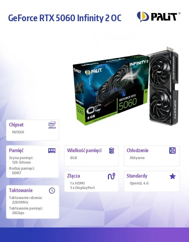 Palit GeForce RTX 5060 INFINITY 2 OC temelji se na modernoj NVIDIA arhitekturi i cilja na igrače i kreatore koji žele performanse bez podešavanja. Minimalistički izgled s motivom beskonačnosti podupire nesmetan protok zraka i čistu estetiku koja se uklapa u većinu kućišta.