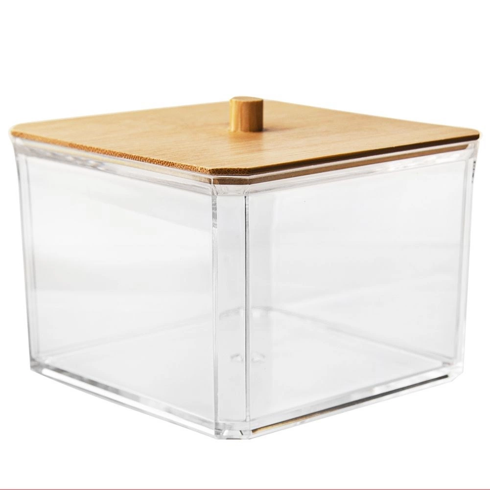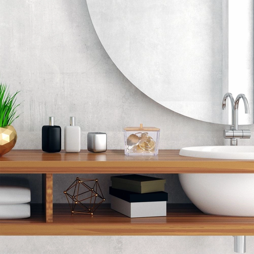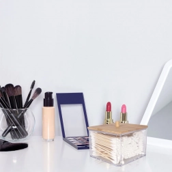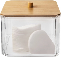 Ovaj elegantni spremnik za pamučne štapiće spaja prozirne stijenke od izdržljive plastike i prirodan izgled bambusova poklopca s praktičnim gumbom. Odlično pristaje u kupaonicu, spavaću sobu ili kozmetički kutak – održava sitnice pregledno organiziranima i bez prašine.