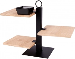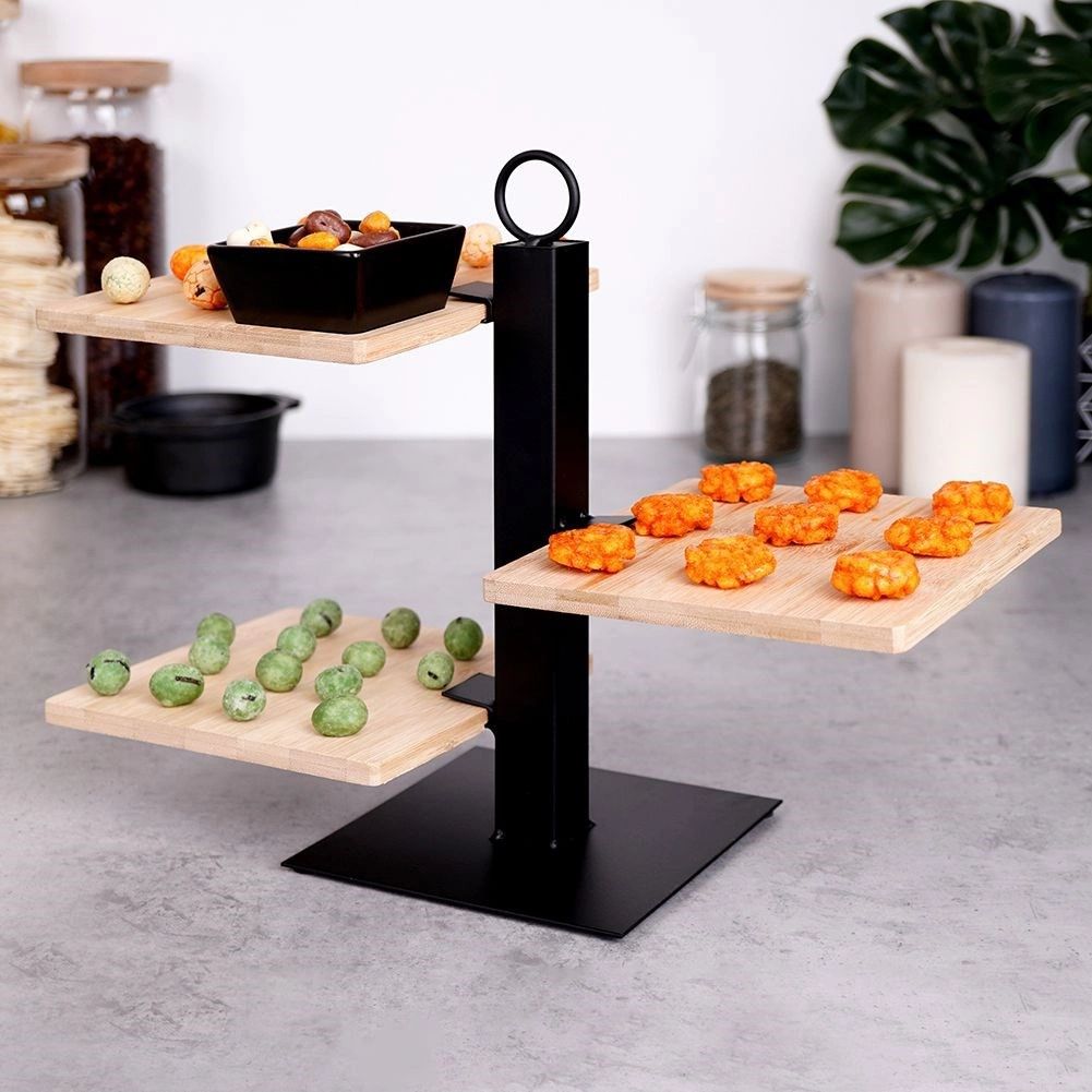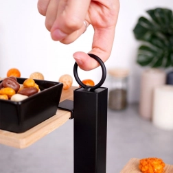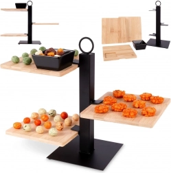 Robusna metalna konstrukcija s crnom završnom obradom i stabilna kvadratna baza (13 × 13 cm) jamče sigurnu upotrebu. Praktična gornja ručka olakšava prenošenje. Etažera je izvrstan izbor za kućne proslave, domjenke, kafiće i catering — istaknut će se na slatkim stolovima, za brunch te kao stalak za posluživanje sireva i suhomesnatih proizvoda.