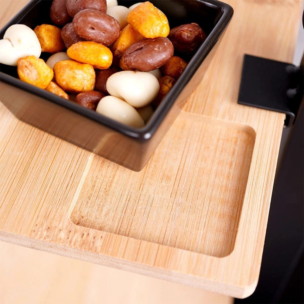 Ova moderna troslojna etažera spaja prirodni bambus s crnim metalom za stajliš prezentaciju slatkih i slanih delicija. Kompaktne dimenzije 32 × 32 × 26,5 cm štede prostor na stolu, dok tri kvadratna pladnja (svaki 14,5 × 14,5 cm) omogućuju pregledan i atraktivan raspored posluženja. U kompletu je i keramička posudica (40 ml; 6,5 × 6,5 × 3 cm) za dipove, umake ili orašaste plodove.