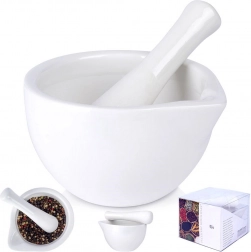 Ovaj bijeli porculanski mužar idealan je izbor za kućne kuhare i ljubitelje gastronomije koji žele iz začina i bilja izvući maksimum okusa i mirisa. Zahvaljujući nepoliranoj unutarnjoj površini učinkovito mrvi i tvrđe namirnice te omogućuje pripremu svježeg pesta, aromatičnih mješavina ili domaćeg currya.