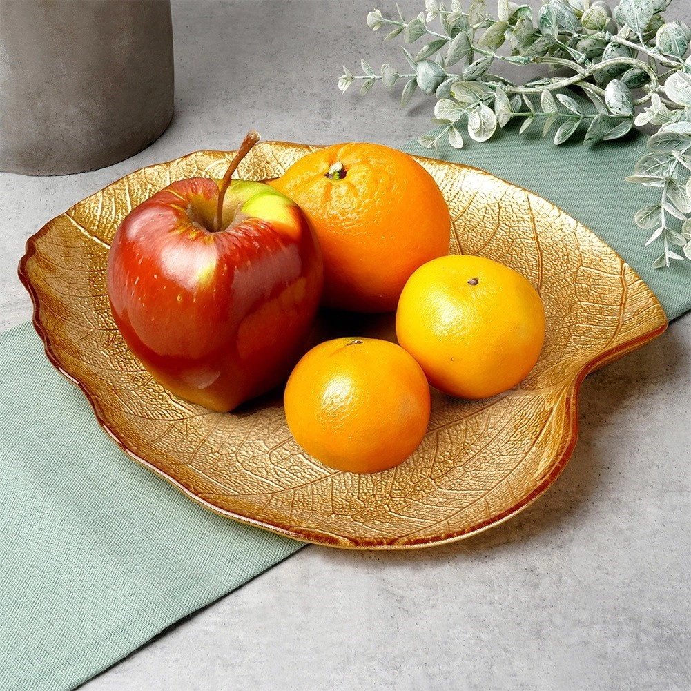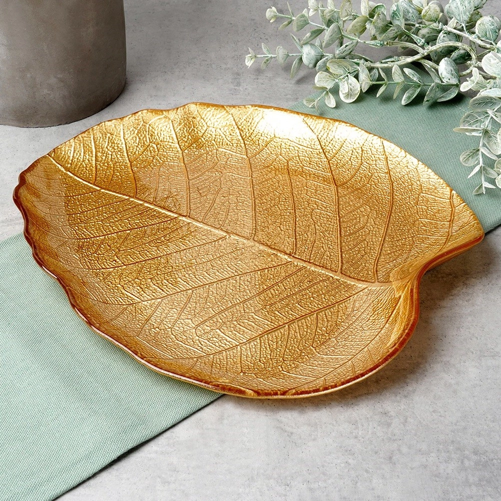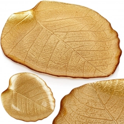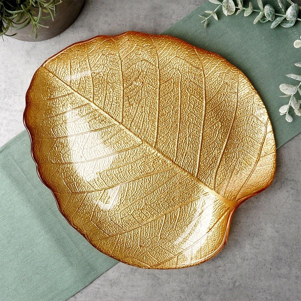 Unesite na stol dašak prirode u premium izdanju. Stakleni tanjur u obliku lista ističe se zlatnim sjajem i detaljnom teksturom žilica koja daje autentičan, elegantan izgled. Savršen za svakodnevno posluživanje i svečane prilike.