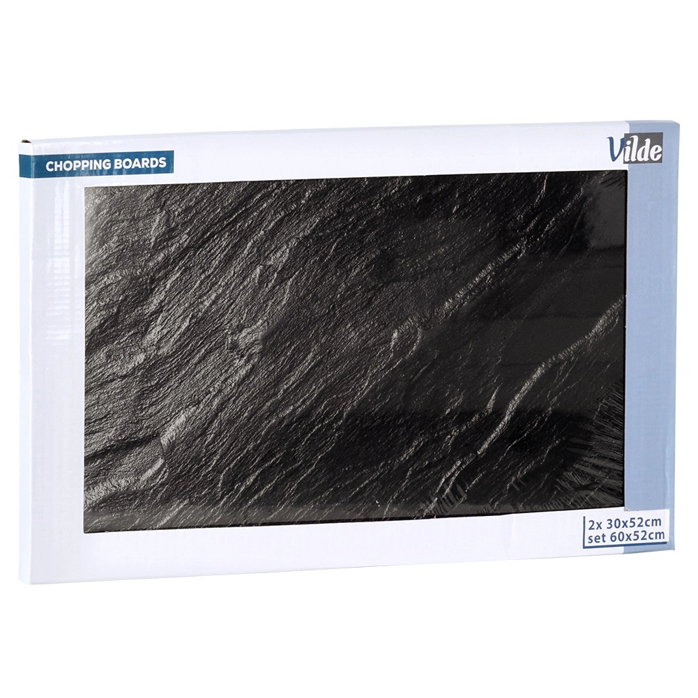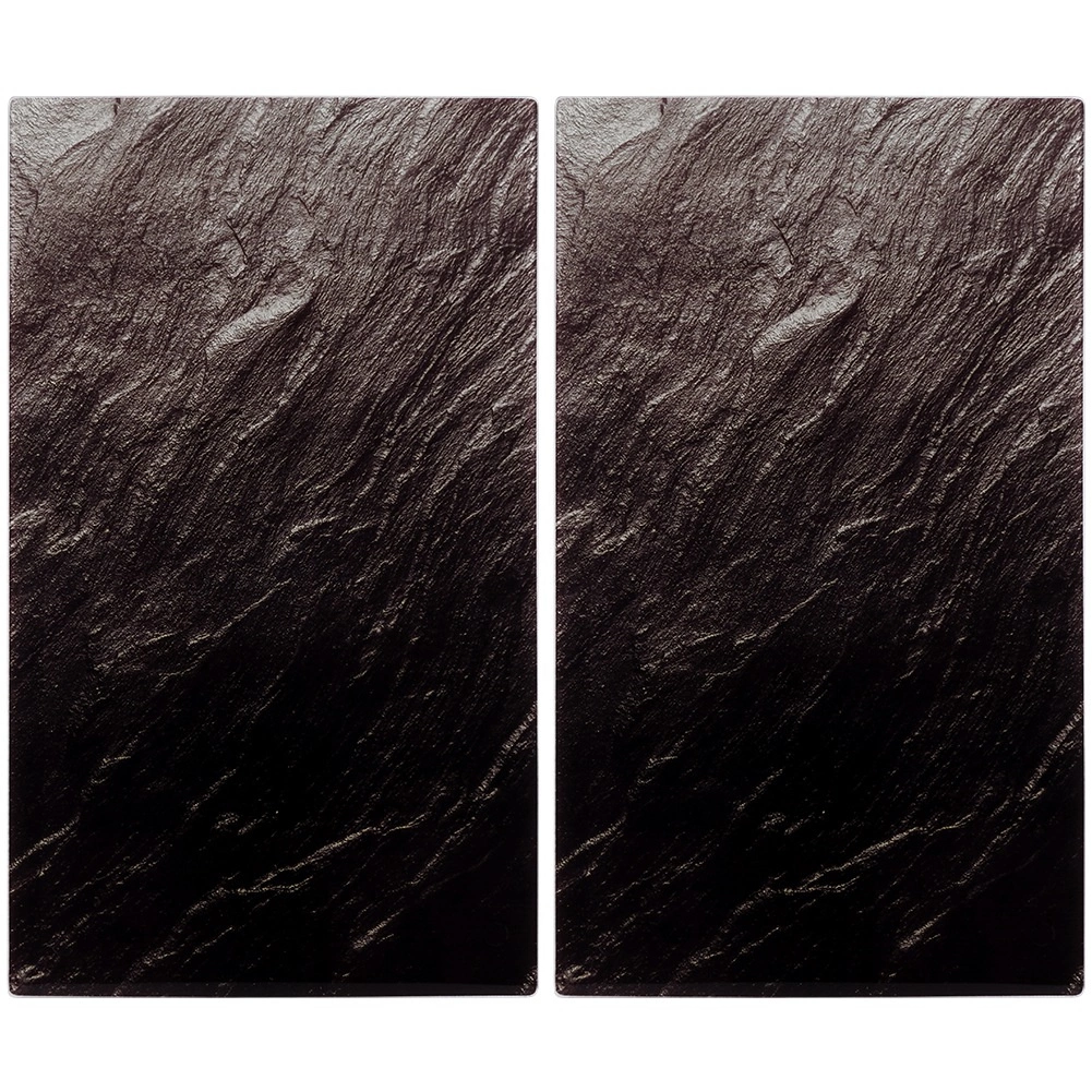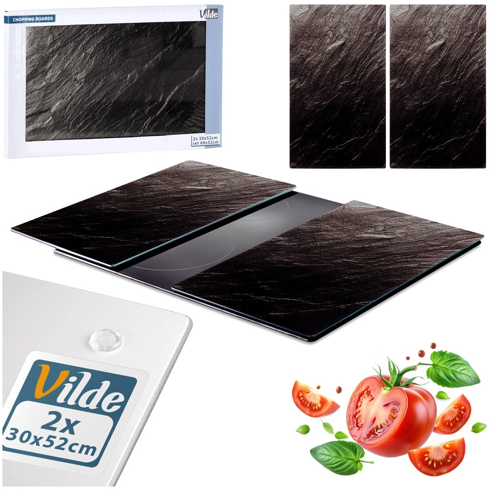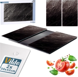 Ovaj dvodijelni set staklenih ploča spaja stil i funkcionalnost. Svaka ploča mjeri 52 × 30 × 0,4 cm, a zajedno stvaraju velikodušnu površinu 60 × 52 cm koju možete koristiti za rezanje, posluživanje i kao poklopac ploče za kuhanje. Kaljeno staklo s crnim kamenim izgledom daje kuhinji moderan naglasak i istovremeno štiti površine od oštećenja.