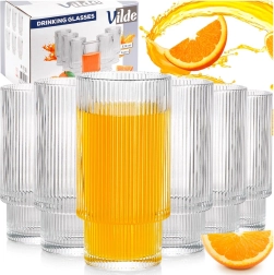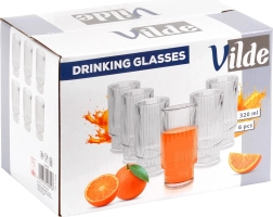 Set čaša Vilde donosi bezvremenski dizajn s vertikalnim rebrima koji osigurava ne samo stiliziran izgled, već i udobno te sigurno držanje. Svaka čaša ima zapreminu 320 ml, visinu oko 14 cm i promjer 7 cm – idealna veličina za svakodnevno posluživanje hladnih napitaka.