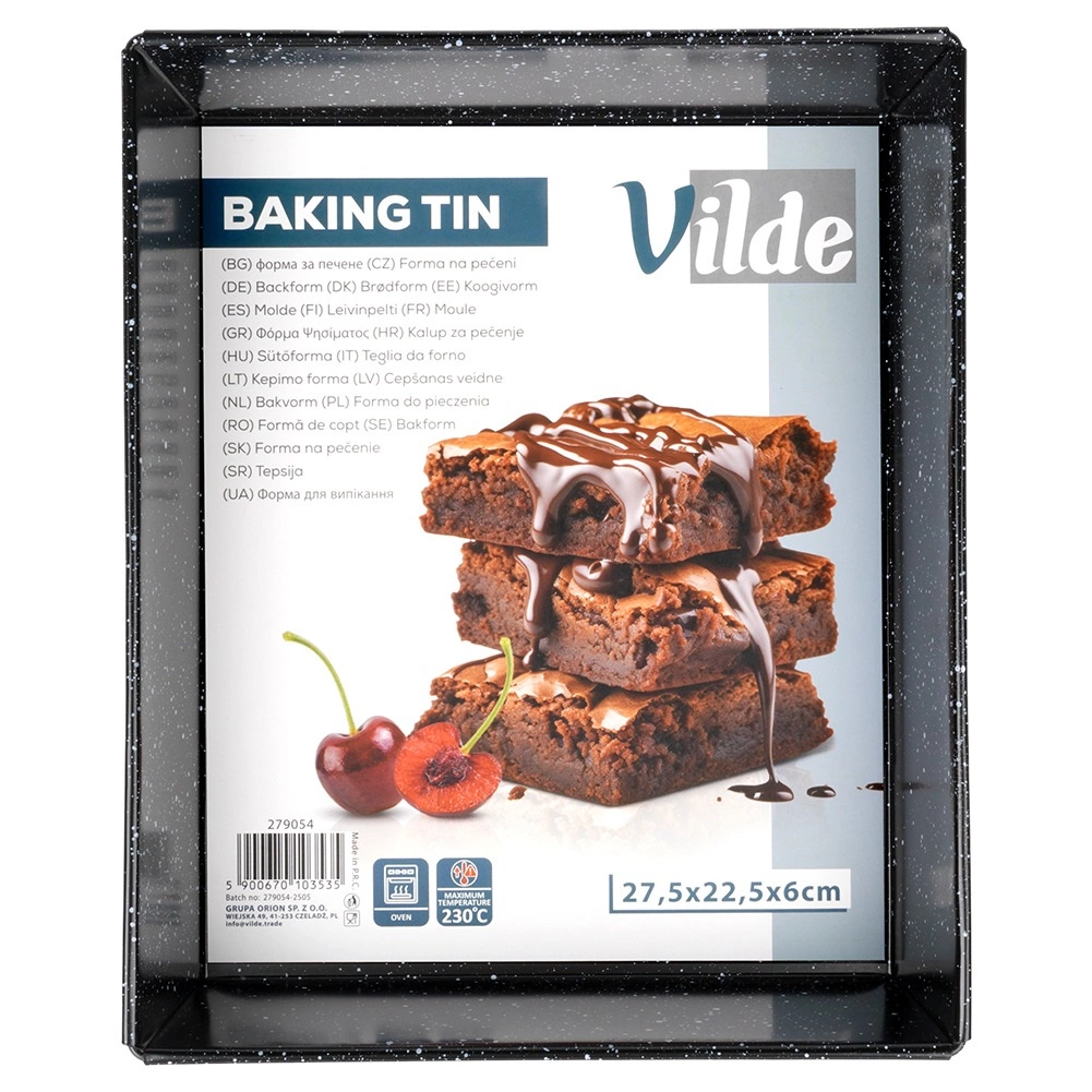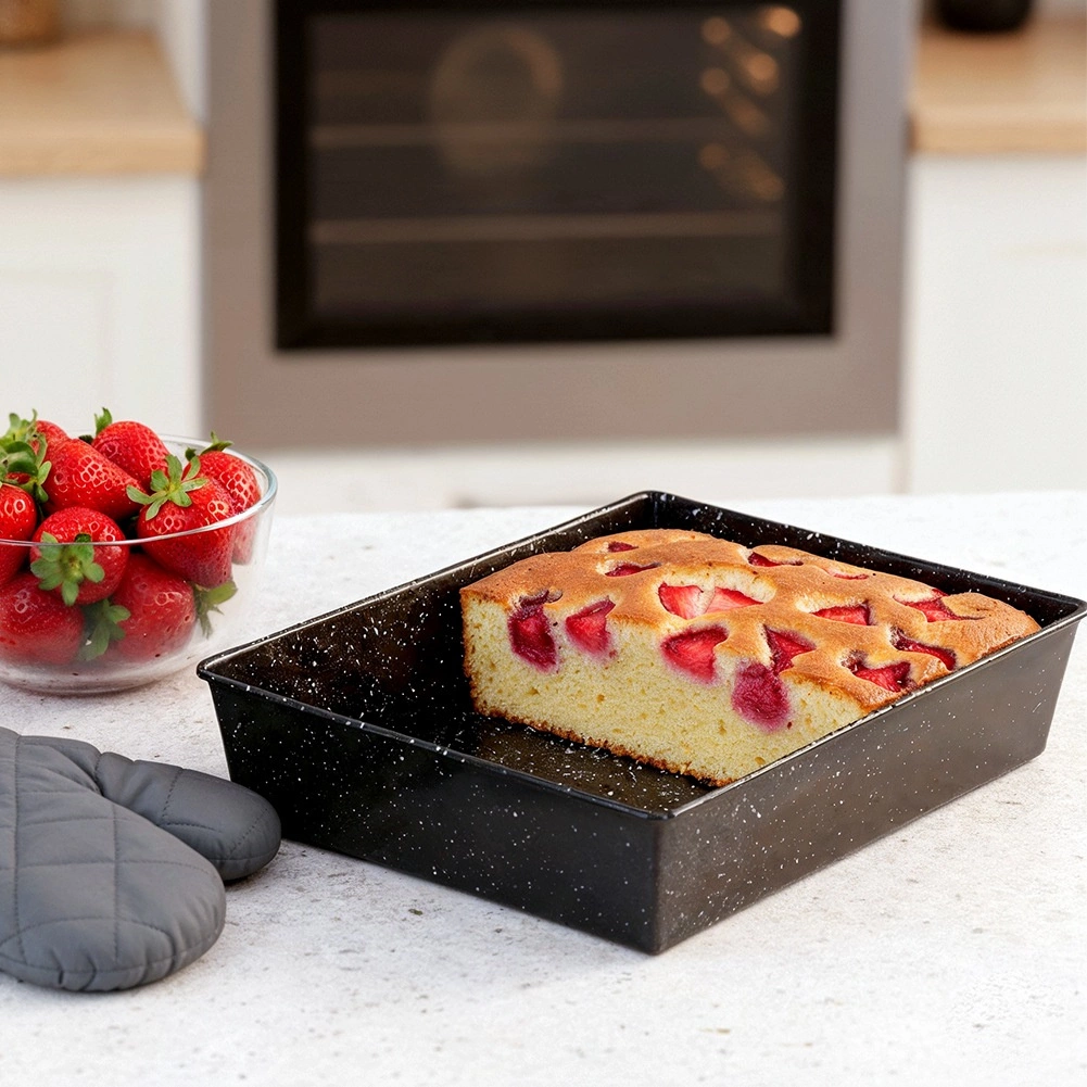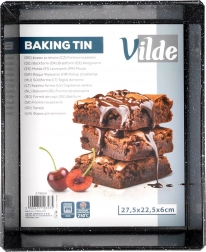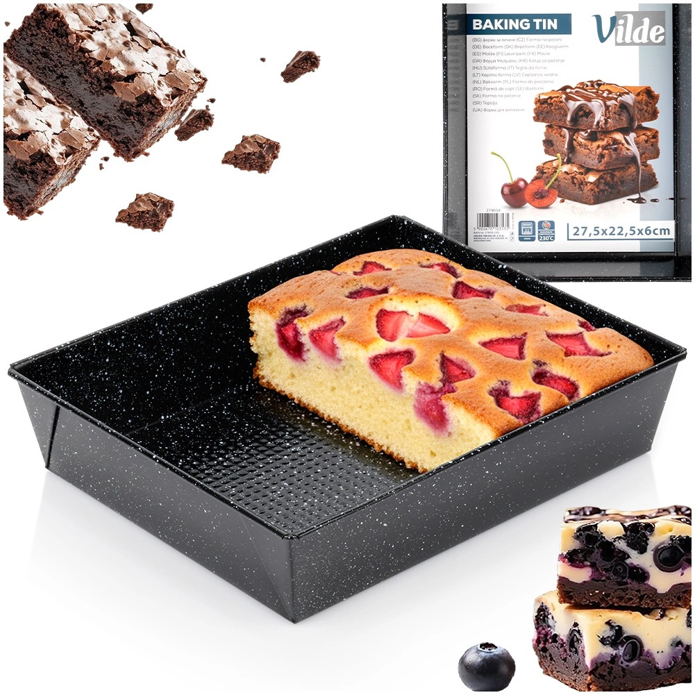 Praktični pravokutni kalup dimenzija 27,5 × 22,5 × 6 cm odličan je izbor za svakodnevno pečenje i svečane menije. Ugljični čelik izvrsno provodi toplinu, što osigurava ujednačeno pečenje i pouzdane rezultate kod slatkih i slanih jela.