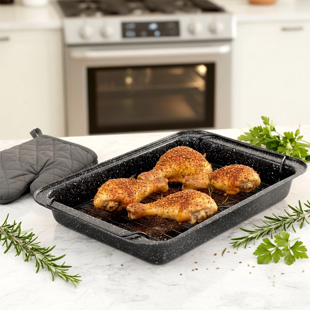 Ovaj robusni pekač dimenzija 37,5 × 25,5 × 5 cm odličan je izbor za svakodnevno kuhanje i blagdansko pečenje. Neljepljiva granitna površinska obrada sprječava zagorijevanje i pri minimalnoj količini masnoće te omogućuje zdraviju pripremu jela. Uklonjiva metalna rešetka drži meso iznad soka od pečenja pa se peče ravnomjerno sa svih strana.