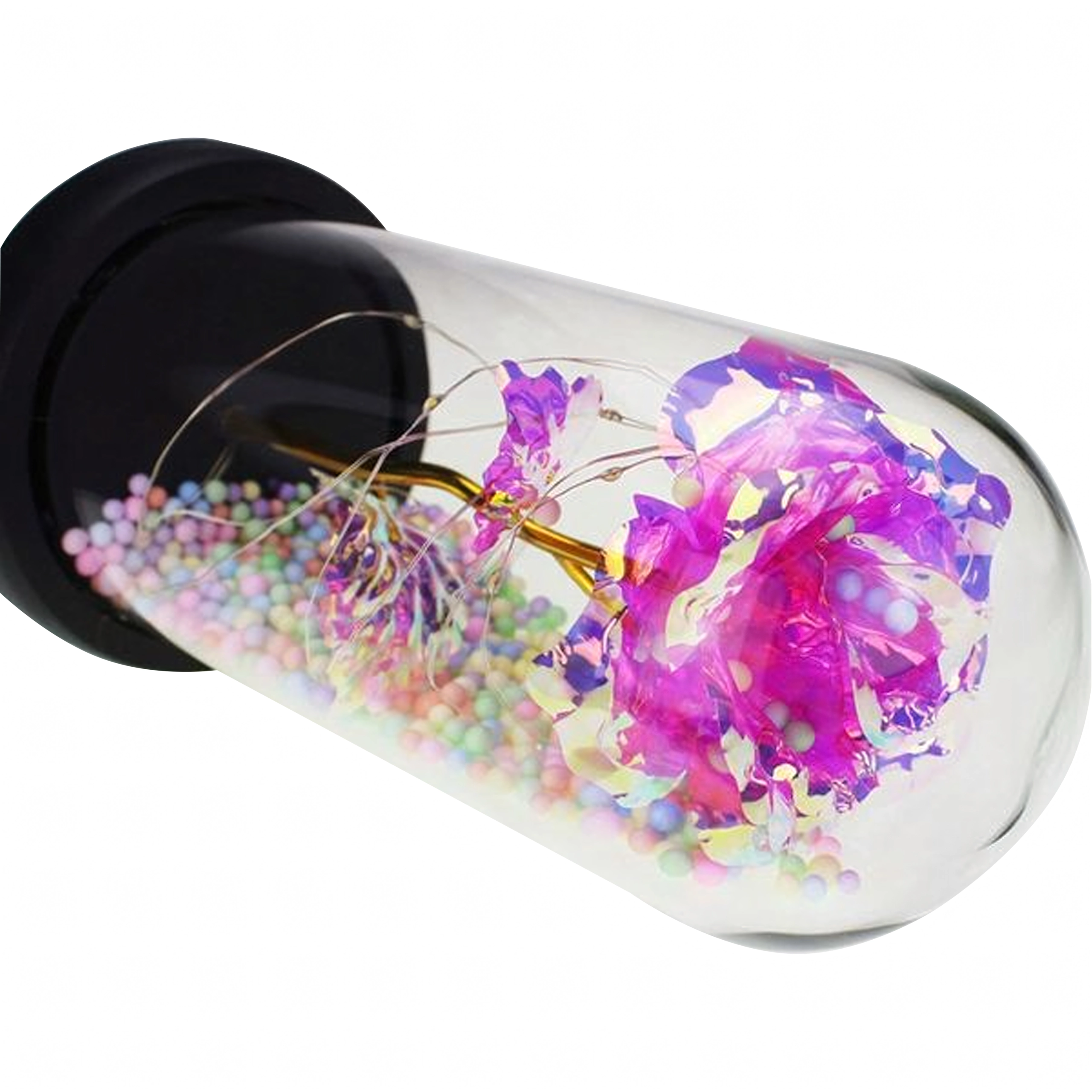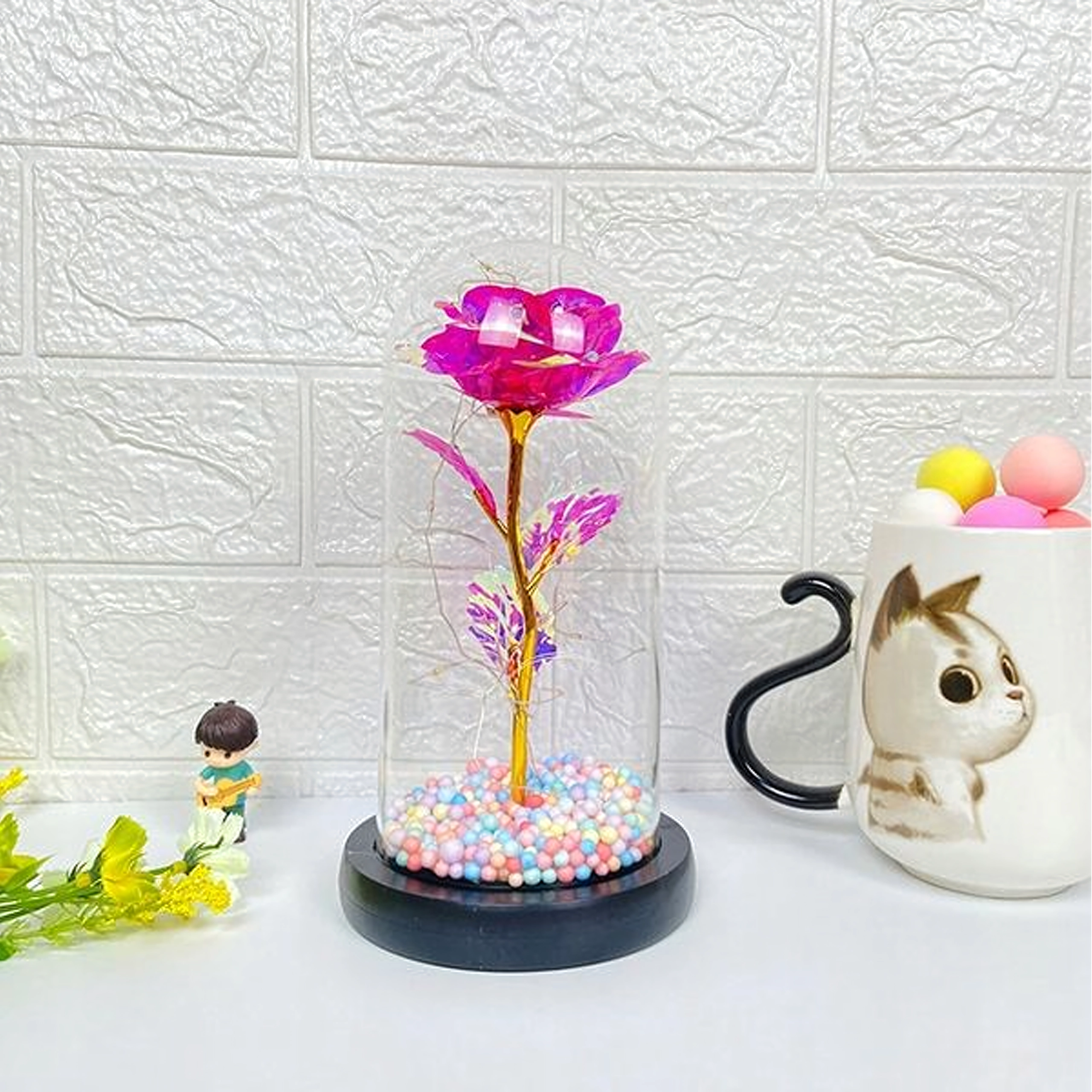 Dekoracija je spremna za trenutačno izlaganje: stabilno postolje, sitne lampice omotane oko stabljike te raznobojne perlice u bazi tvore harmoničnu cjelinu. Zahvaljujući napajanju na baterije lako je postavite na noćni ormarić, policu ili svečani stol bez obližnje utičnice.
