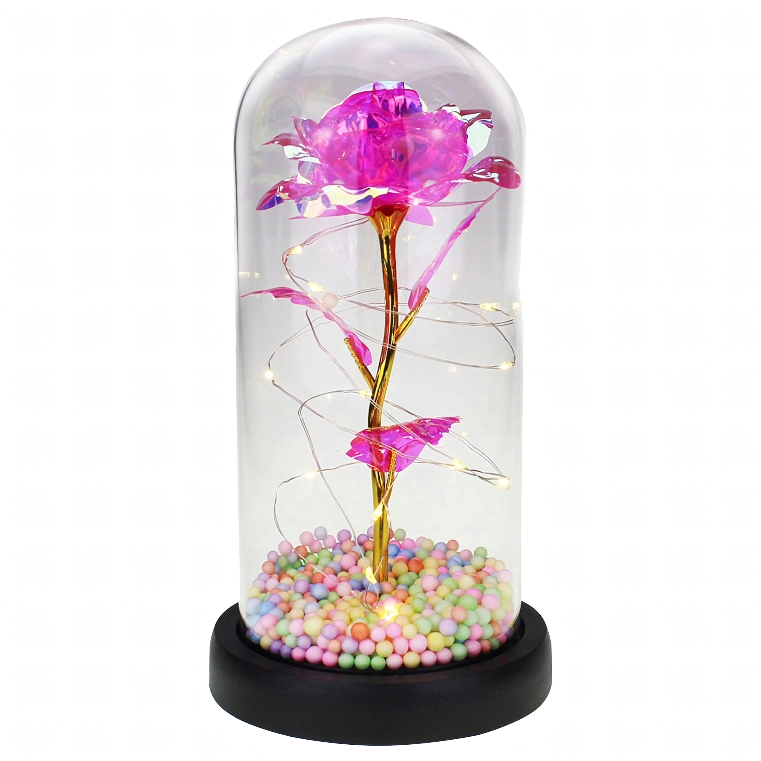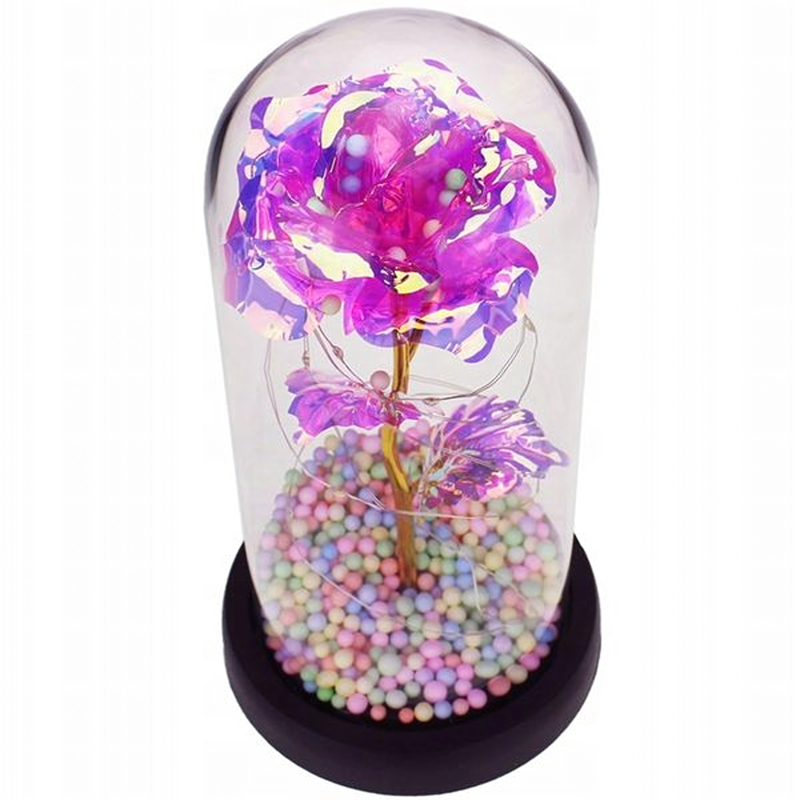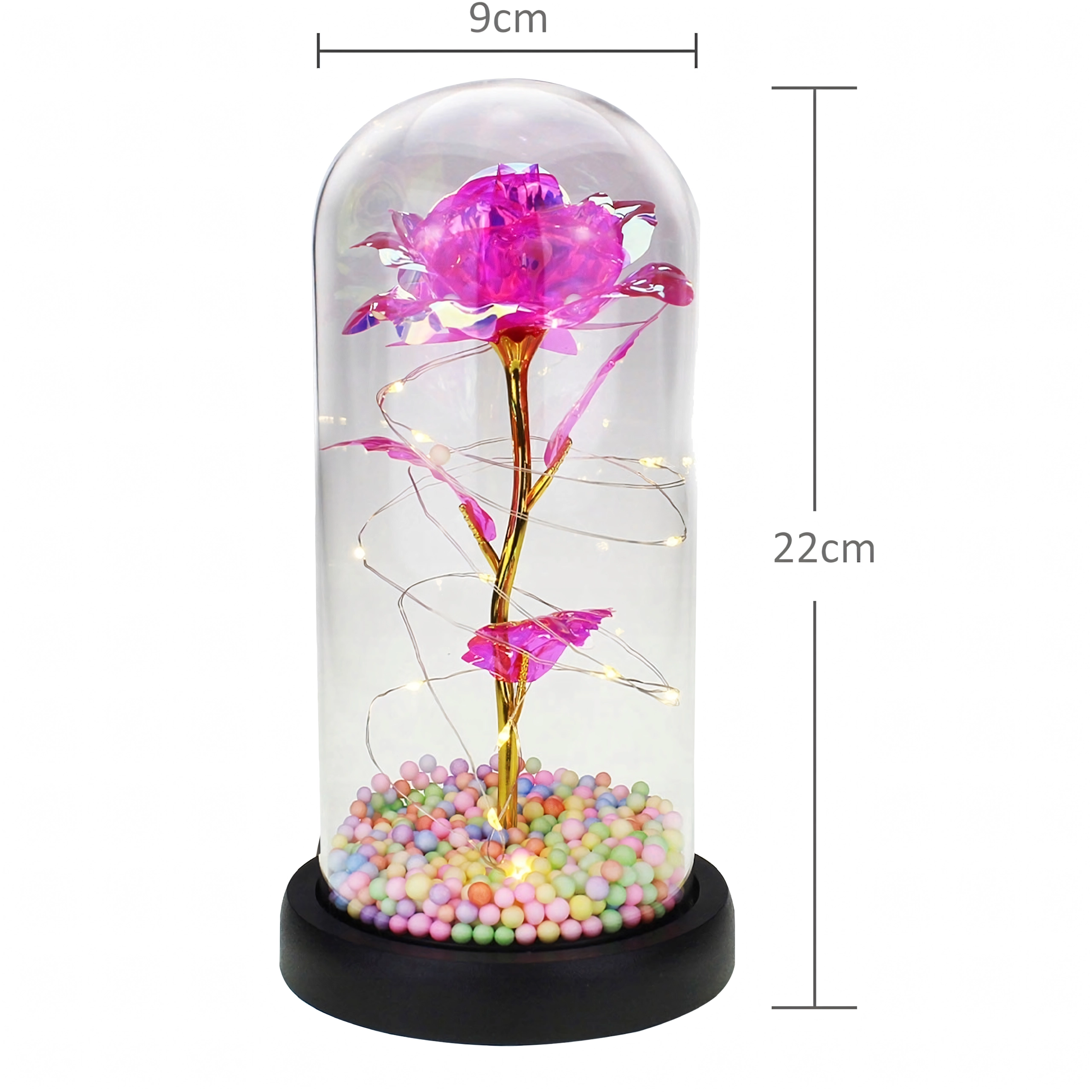Elegantna LED ruža pod staklenim zvonom unijet će u svaki interijer toplo, blistavo svjetlo. Kombinira moderno LED osvjetljenje s bezvremenskim simbolom ljubavi – ružom – stvarajući dojmljiv kućni detalj i nezaboravan poklon. Zvon štiti cvijet od prašine i naglašava njegovu nježnu svjetlost.