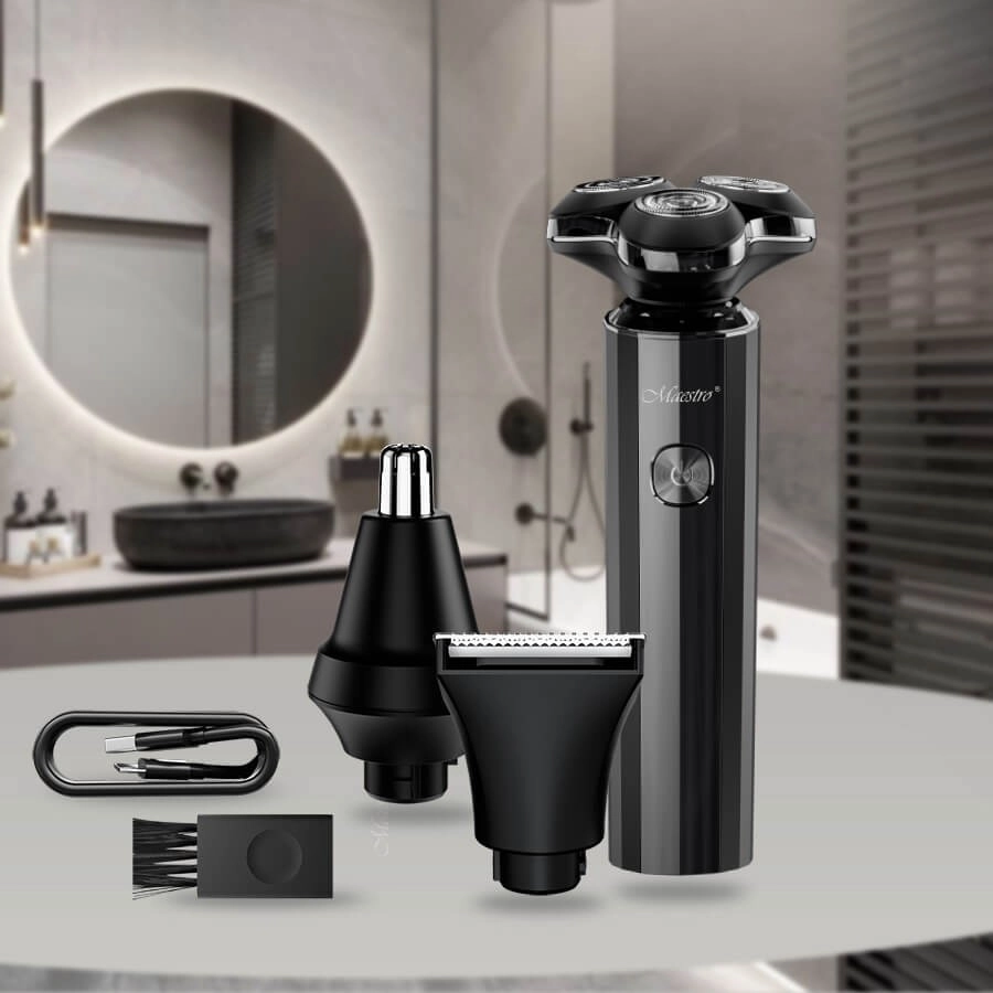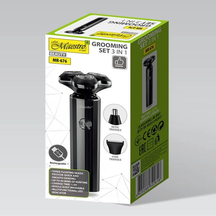 Set za brijanje 3u1 USB‑C MR‑676 Maestro praktično je rješenje za potpunu njegu brade i kose. Kombinira snažan brijaći aparat, precizan trimer za nos i uši te svestrani trimer za kosu s podesivim duljinama. Zahvaljujući kapacitivnoj litij bateriji od 800 mAh postiže do 90 minuta neprekidnog rada, a potpuno se puni za samo 90 minuta putem USB‑C.