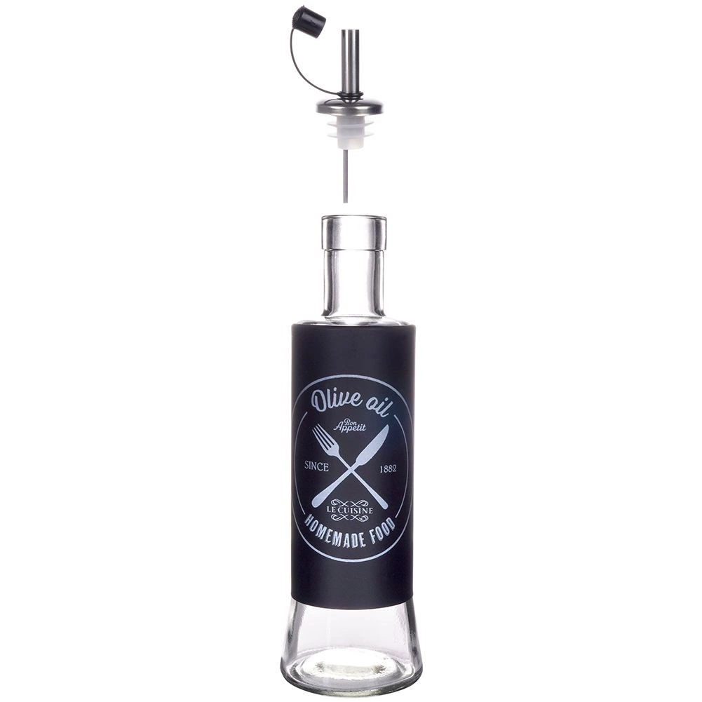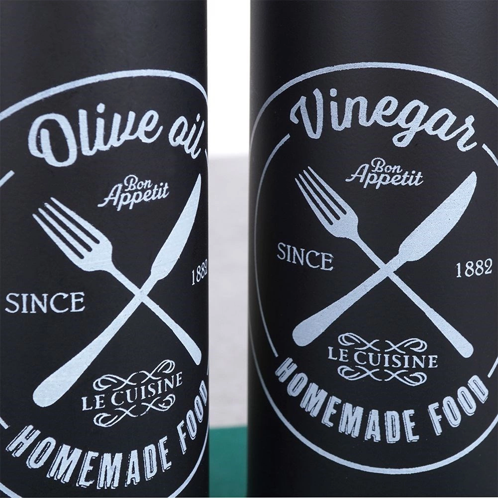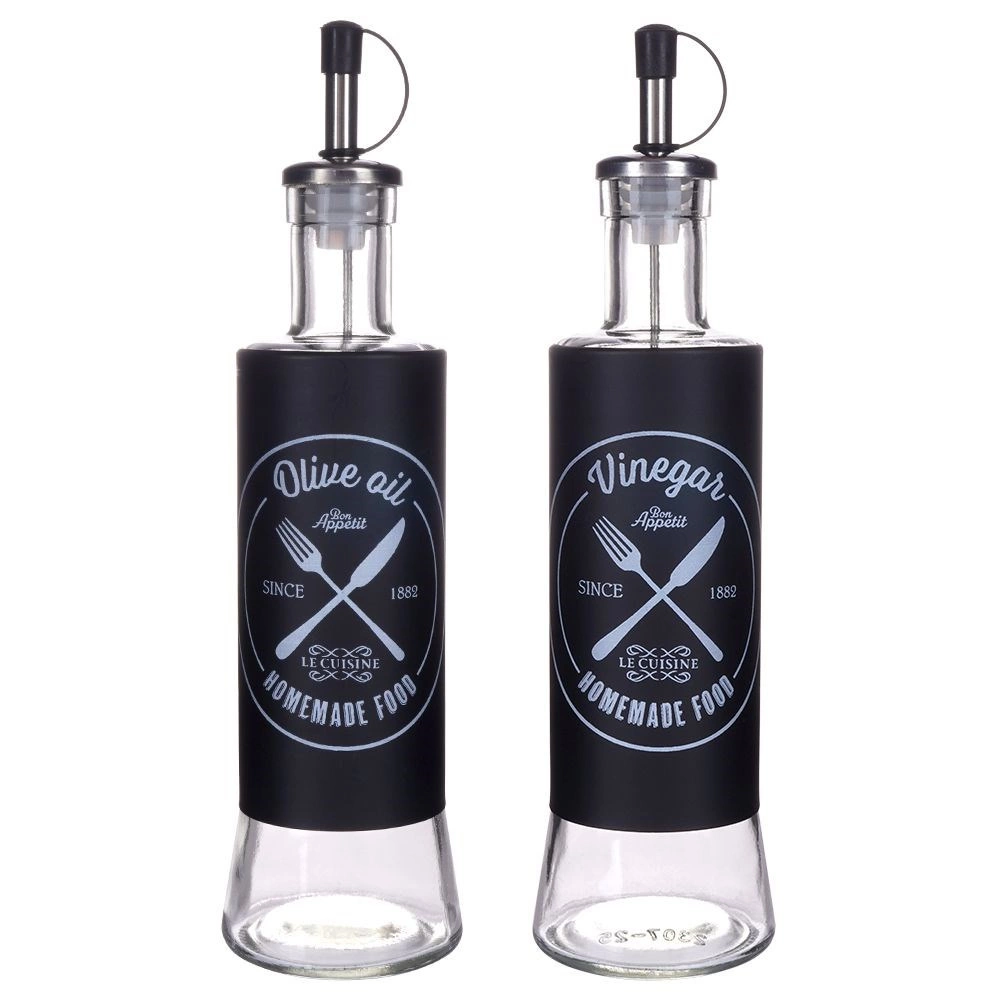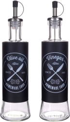 Elegantni set dviju staklenih boca zapremnine 300 ml za maslinovo ulje i ocat s metalnim dozatorom i zaštitnim čepom. Nudi precizno doziranje, točenje bez kapanja i moderan crni dizajn s bijelim natpisima za lako razlikovanje. Idealan za kuhinju i ugostiteljstvo.