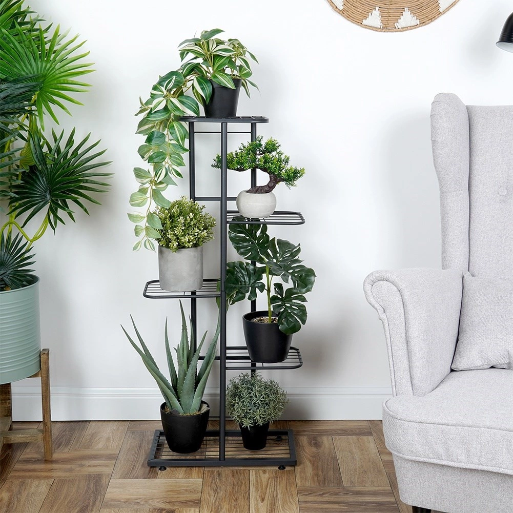 Pet razina polica omogućuje bogatu zelenu kompoziciju bez zatrpavanja poda. Idealno uz prozor, u kut dnevnog boravka ili na natkriveni balkon.