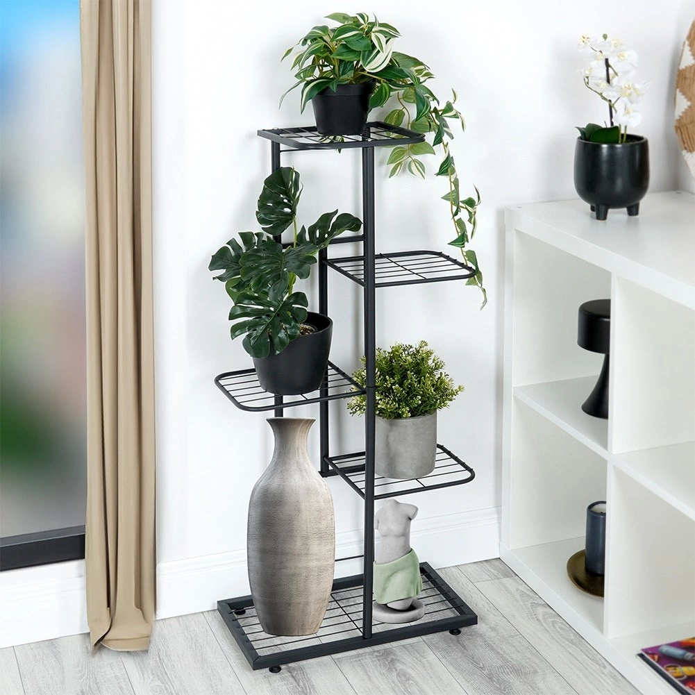 Stilski metalni stalak za cvijeće s pet razina u mat crnoj boji osigurava vertikalno izlaganje biljaka na pet nivoa i uštedu prostora u interijeru. Nudi stabilnu konstrukciju, jednostavno održavanje i univerzalnu primjenu za cvijeće, dekoracije i fotografije.
