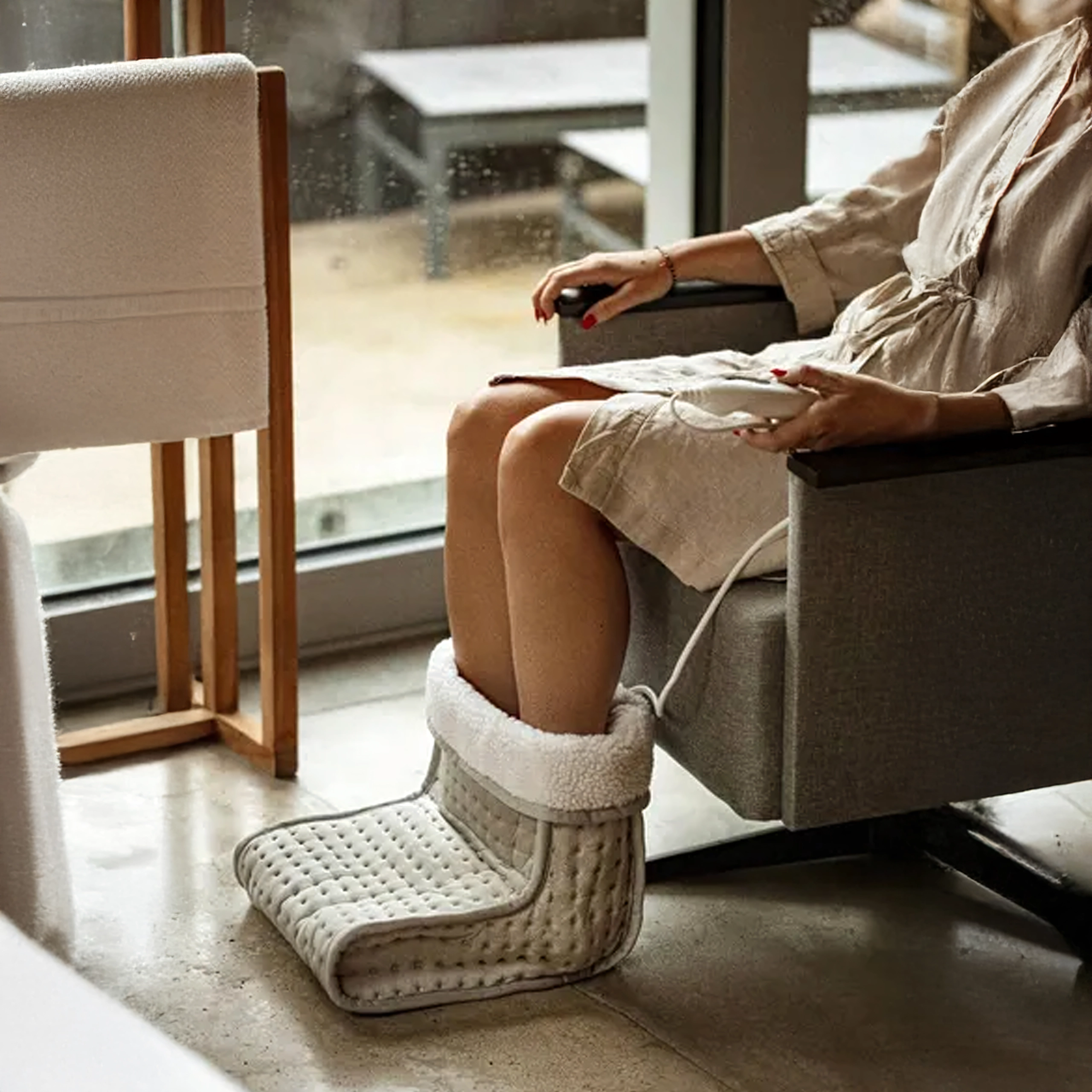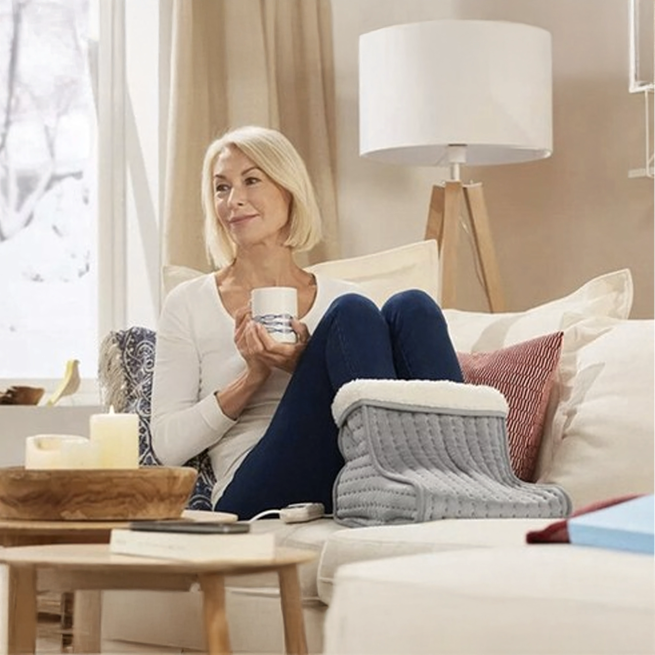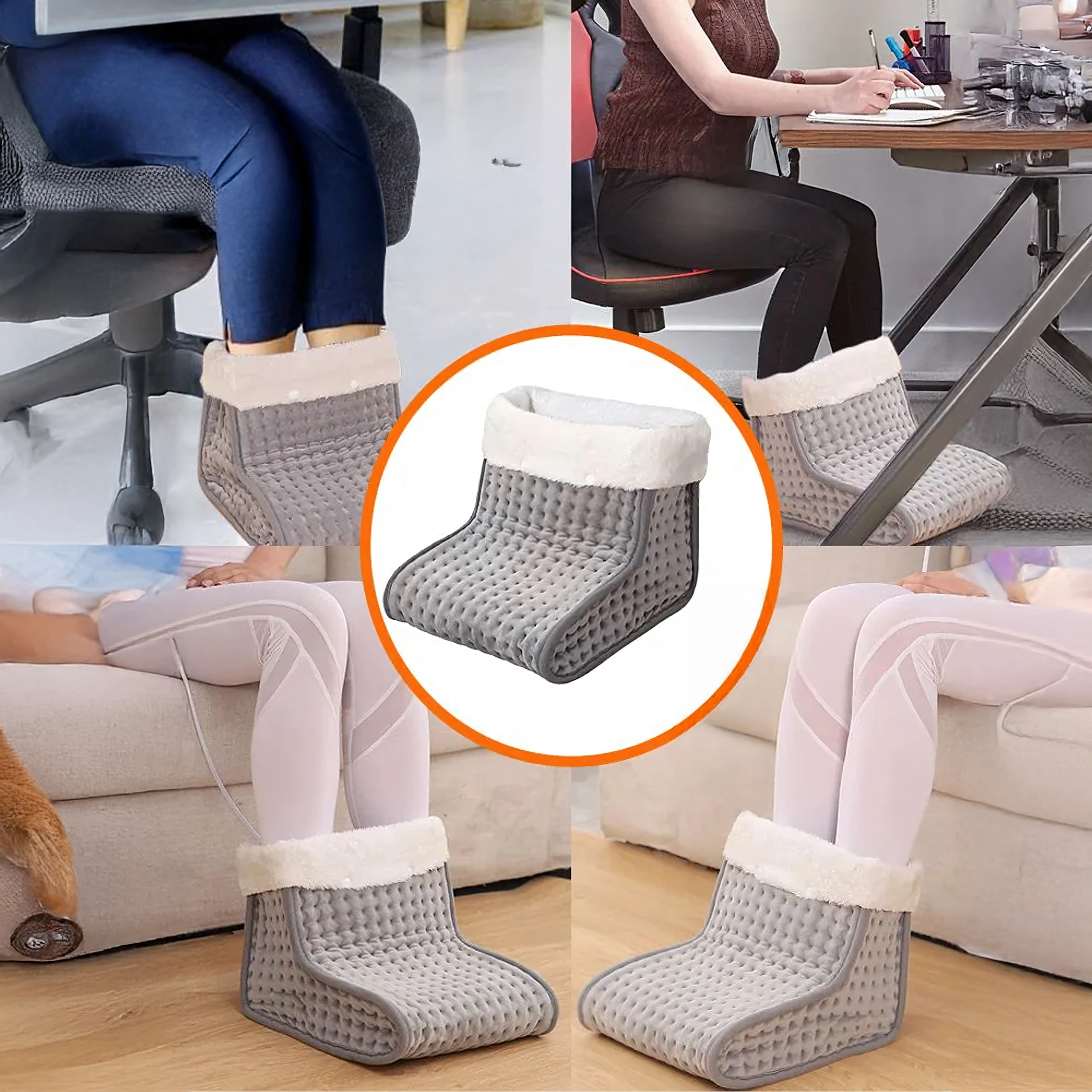 Prostrani “boot” dizajn s mekom flis podstavom obavija stopala i osigurava ravnomjernu, umirujuću toplinu pri sjedenju na kauču ili za radnim stolom.