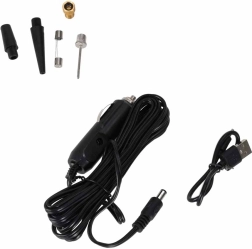 električna pumpa/mini kompresor, crijevo, 5× izmjenjivi nastavak, USB kabel, kabel za upaljač u autu, upute