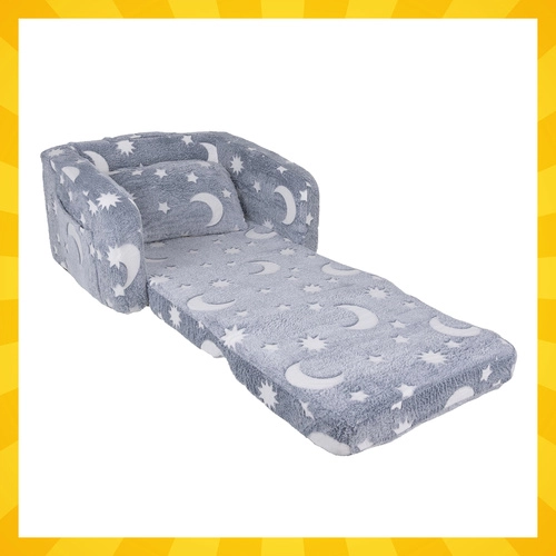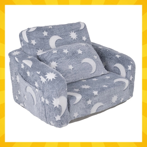 Mekša udobnost i zabava u jednom – sklopiva dječja foteljica Kruzzel lako se pretvara u ležaljku za čitanje, odmor i priče. Vrlo lagana, sigurna i jednostavna za prenošenje, s praktičnim bočnim džepom i nježnim plišanim presvlakom. Fluorescentni mjeseci i zvjezdice nježno svijetle u mraku i stvaraju umirujuću atmosferu za mirno uspavljivanje.