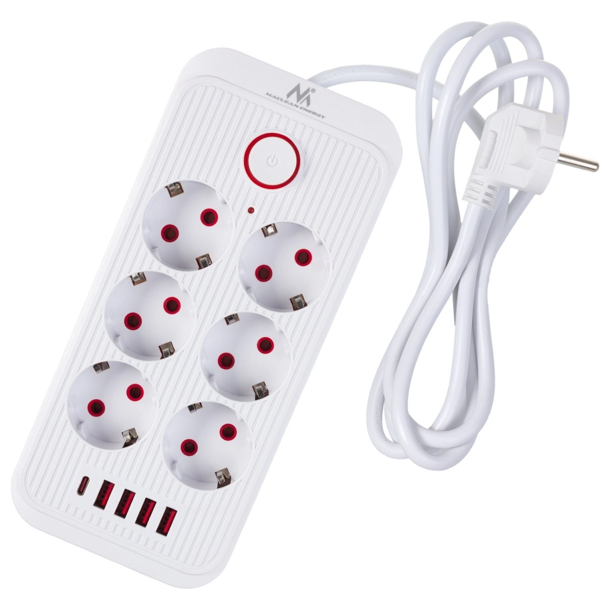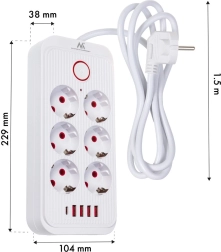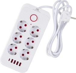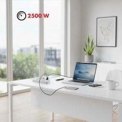 Univerzalni produžni razdjelnik sa 6 utičnica i 5 USB priključaka (4× USB‑A, 1× USB‑C) za istodobno napajanje i punjenje više uređaja. Pruža snagu 2500 W, podržava 110–240 V / 50–60 Hz i zahvaljujući čvrstoj konstrukciji idealan je za ured, dom i gaming kutak.