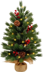 Kompaktni umjetni božićni bor visine oko 60 cm lijepo će osvijetliti svaki interijer. Ima toplo LED osvjetljenje s 3 načina rada, realistične iglice, dekor crvenih bobica i prirodnih češera te stabilno postolje obavijeno jutom. U pakiranju su baterije 3× AG13 za trenutačnu upotrebu.