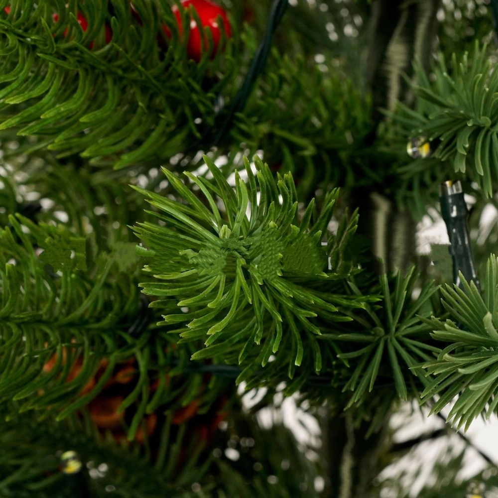 Integrirani LED svjetlosni lanci s 3 načina rada pružaju nježno toplo svjetlo. Savijiva konstrukcija grančica omogućuje lako oblikovanje, dok dekor crvenih bobica i češera daje prirodan i klasičan izgled. Otežano postolje obavijeno jutom drži bor čvrsto na mjestu i naglašava rustikalni stil.