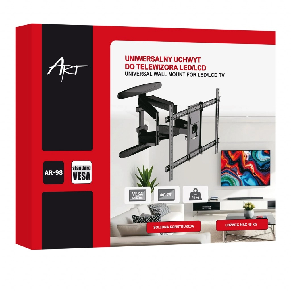 Ovaj robustan zglobni nosač za TV dizajniran je za moderne LCD/LED zaslone dijagonale 40–75". Zahvaljujući visokoj nosivosti od 45 kg i širokoj podršci standarda VESA 200×200 do 600×400, pouzdano nosi većinu televizora vodećih marki. Promišljena konstrukcija omogućuje udobno podešavanje nagiba, okretanja i izvlačenja za savršen kut gledanja u svakoj prostoriji.