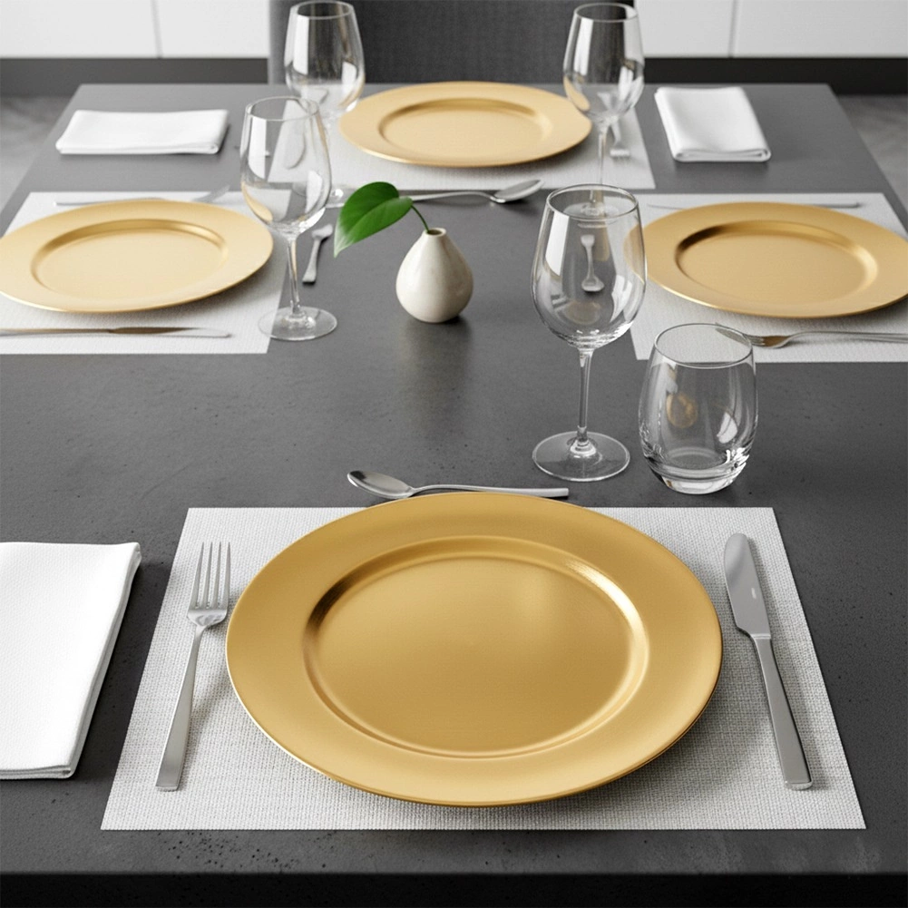 Široki rub i metalni efekt daju postavci stola reprezentativan izgled – idealno za svečane trpeze i svakodnevnu eleganciju.