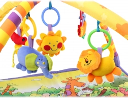 Igračke različito zveče i pište, čime potiču razvoj sluha, dodira te fine i grube motorike. Zahvaljujući prstenovima koji se mogu otvoriti, lako ih odvojite i dijete može ponijeti svoje omiljene prijatelje sa sobom. Podloga je kompaktna, brzo se rasklapa i sklapa, a zahvaljujući prijenosnoj plastičnoj torbi možete je ponijeti bilo kamo.