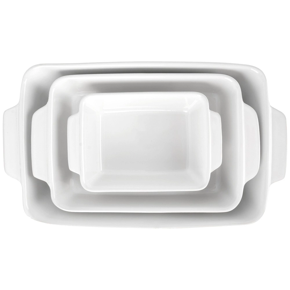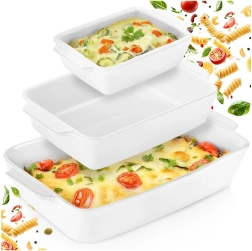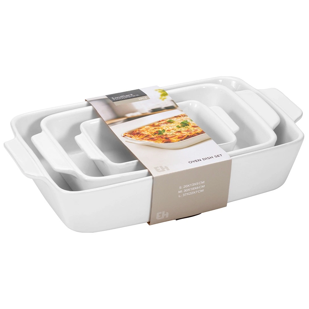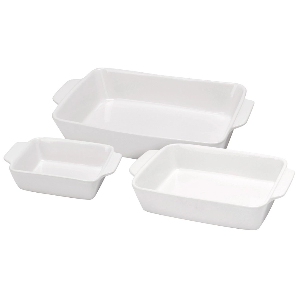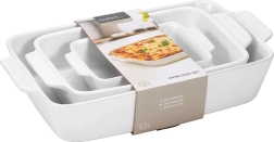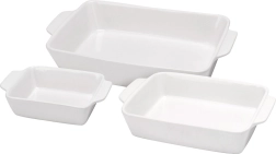 Ovaj elegantan set triju pravokutnih posuda za pečenje od kvalitetne kamenine idealan je za lazanje, zapečeni krumpir, povrtna i mesna jela, ali i pite i deserte. Glatka glazura lako se čisti, a zahvaljujući čistom bijelom dizajnu jela možete poslužiti izravno iz pećnice na stol.