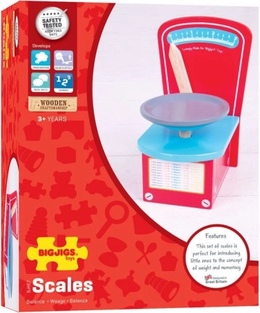 Ova potpuno drvena funkcionalna vaga Bigjigs Toys idealan je dodatak dječjoj kuhinjici. Djeca tijekom igre kuhanja uvježbavaju zbrajanje i oduzimanje, procjenu težine te socijalne vještine u zajedničkoj igri.