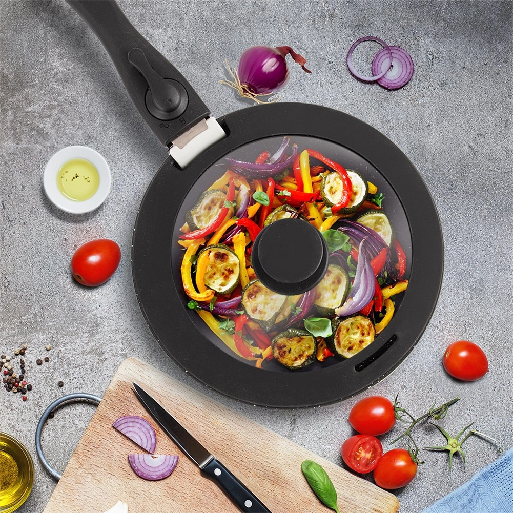 Praktičan poklopac od borosilikatnog stakla s elastičnim silikonskim obrubom osigurava tijesno prianjanje na posuđe i sigurno kuhanje bez nepotrebnog gubitka topline. Zahvaljujući prozirnom staklu jelo imate stalno pod kontrolom, dok uzdužni parni ventil omogućuje kontrolirano ispuštanje pare i olakšava izlijevanje tekućina.
