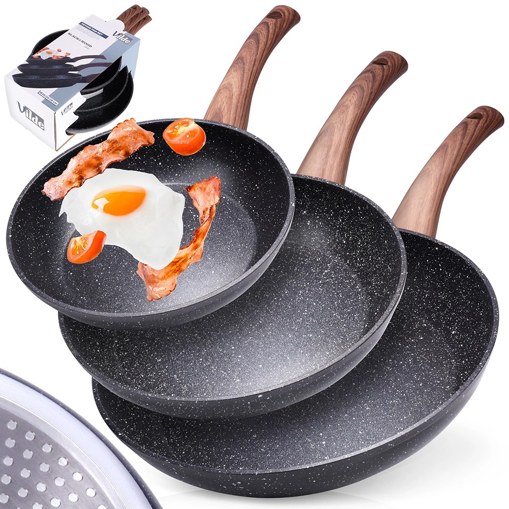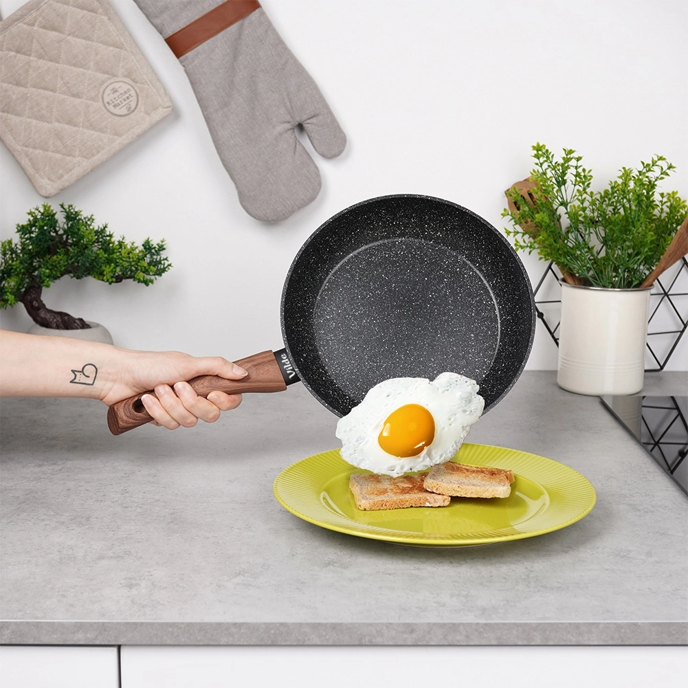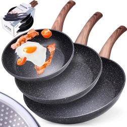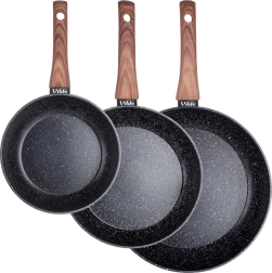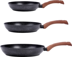 Stilisan set triju tava veličina 20, 24 i 28 cm s izdržljivom granitnom neljepljivom površinom, ravnomjernom raspodjelom topline i ergonomskim ručkama s drvenim dekorom. Pogodno za sve vrste štednjaka uključujući indukciju, lako se čisti i može u perilicu posuđa. Idealno za zdravo kuhanje s minimalno masnoće te za svakodnevno prženje i dinstanje.