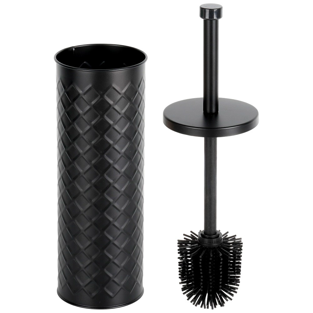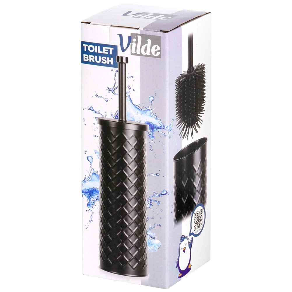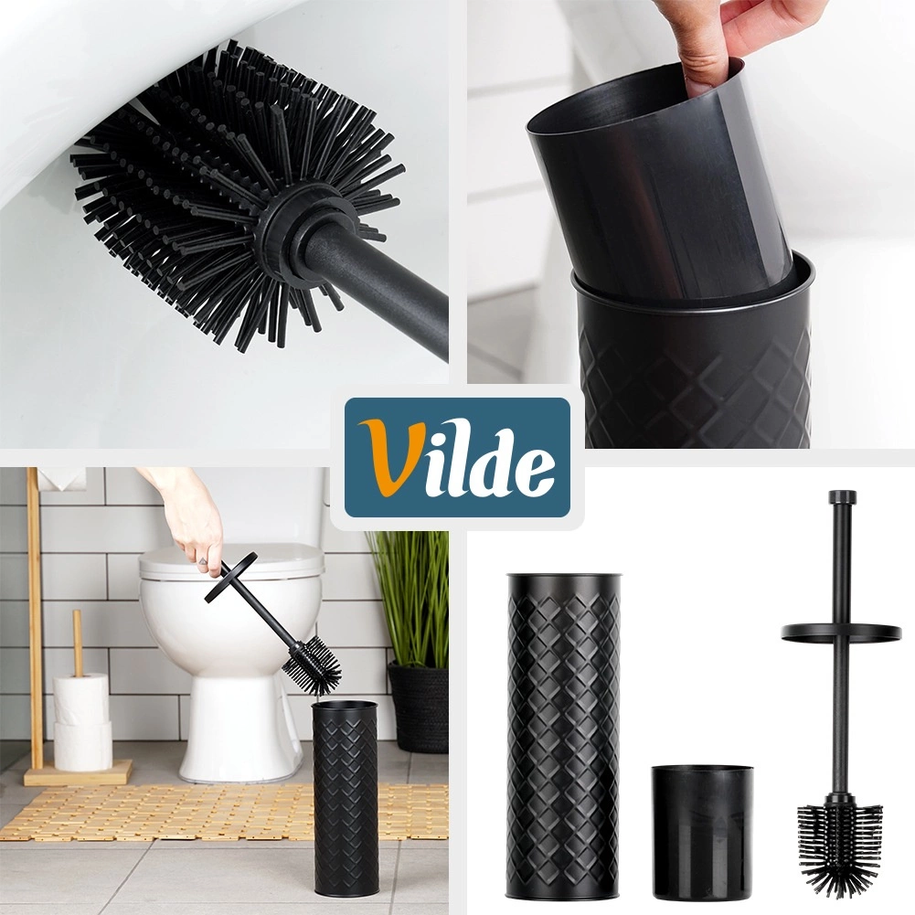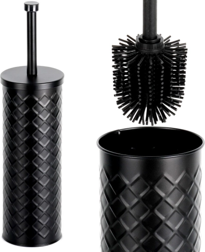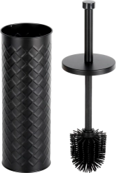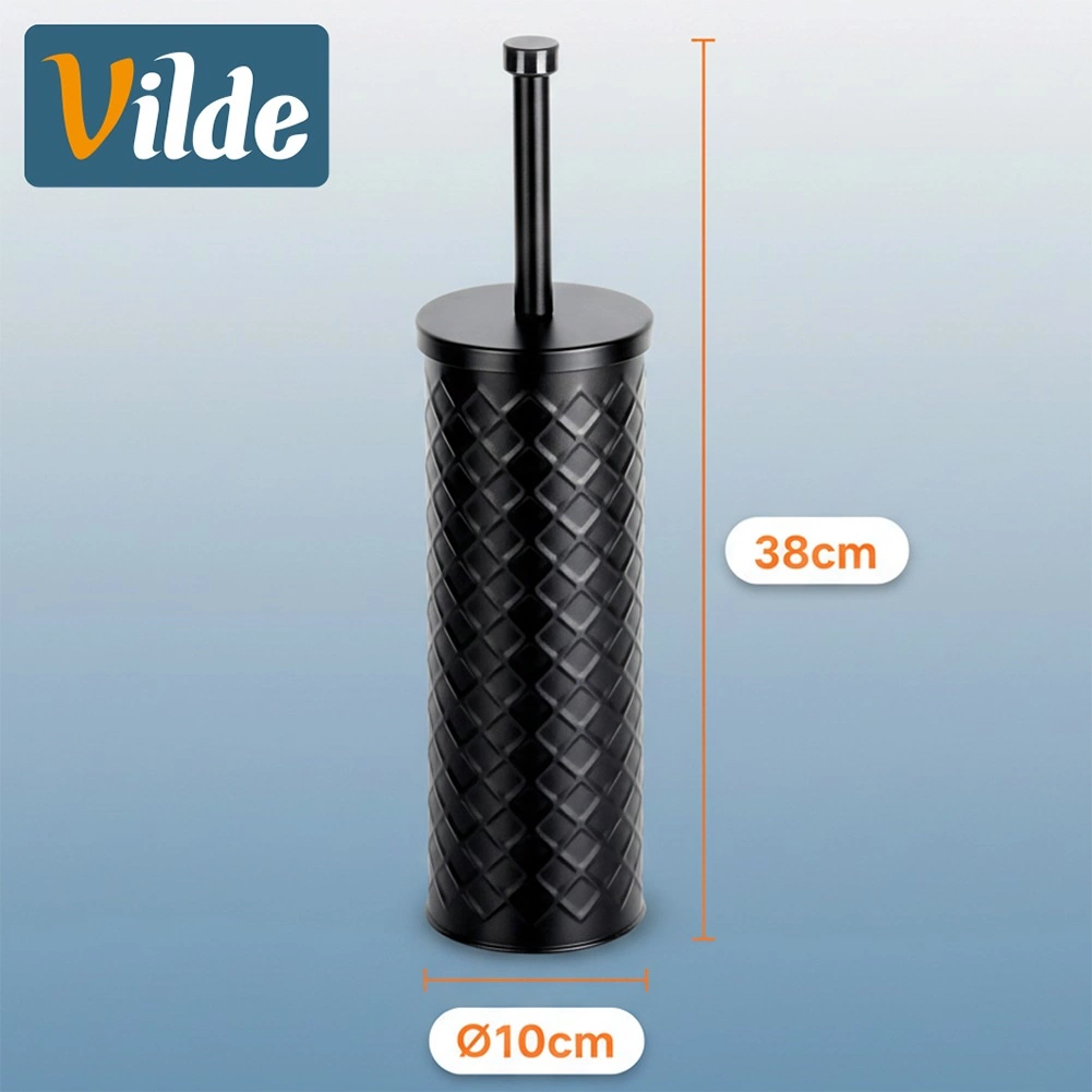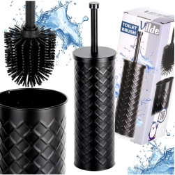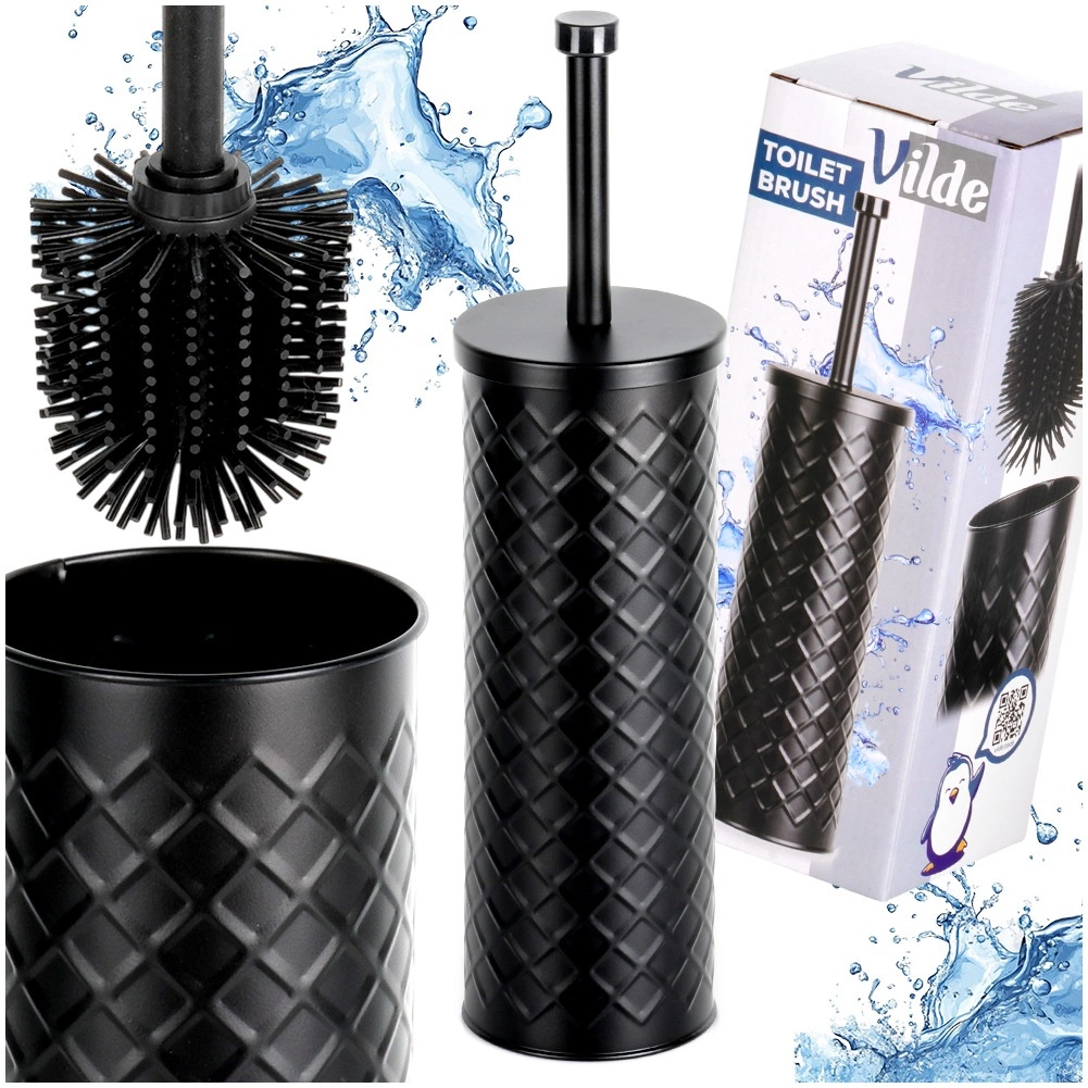 Elegantna silikonska WC četka s metalnim stalkom u mat crnoj boji za higijensko i nenametljivo održavanje toaleta. Zatvoreni držač s ocjeđivačem osigurava čisto i suho odlaganje, silikonska glava se lako ispire i ne upija nečistoće. Stabilna metalna posuda s reljefnim uzorkom i udobna duga drška za higijensko čišćenje. Klasičan i moderan dizajn savršeno se uklapa u svaku kupaonicu.