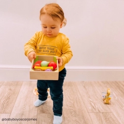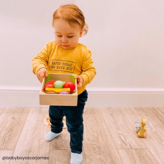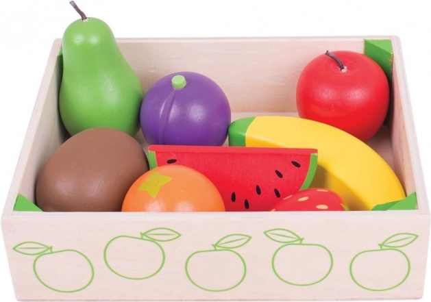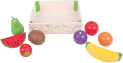 U ovoj kutiji ćete pronaći raznoliko drveno voće, kao što su banane, jabuke, jagode ili kruške. Za djecu je to izvrsna igračka koja ih ne samo zabavlja, već ih i obrazuje o značaju zdrave i uravnotežene prehrane. Igra je dizajnirana za razvijanje fine motorike, a tijekom igre djeca također uče odakle dolazi njihova hrana i kako se priprema.