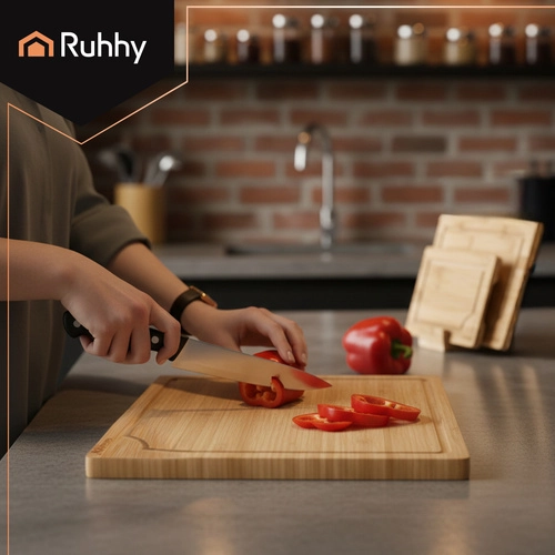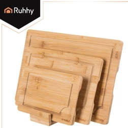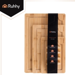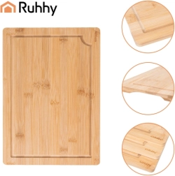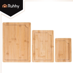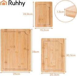 Praktičan set triju bambusnih daski RUHHY u različitim veličinama s čvrstim stalkom za pregledno odlaganje. Prirodni bambus je izdržljiv i higijenski, nježan prema oštricama noževa i brzo se suši. Integrirani žljebovi za odvod soka pomažu održati red pri rezanju mesa, povrća i voća. Idealan za svaku kuhinju za rezanje i posluživanje.