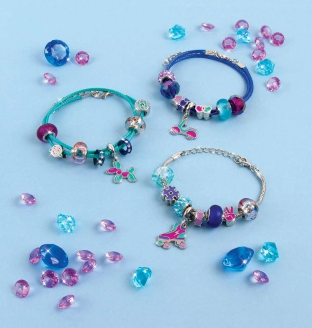 Set sadrži materijal za izradu triju stilskih narukvica u plavo‑ljubičastim tonovima – idealno za dijeljenje s prijateljicama ili za kombiniranje više narukvica na ruci.