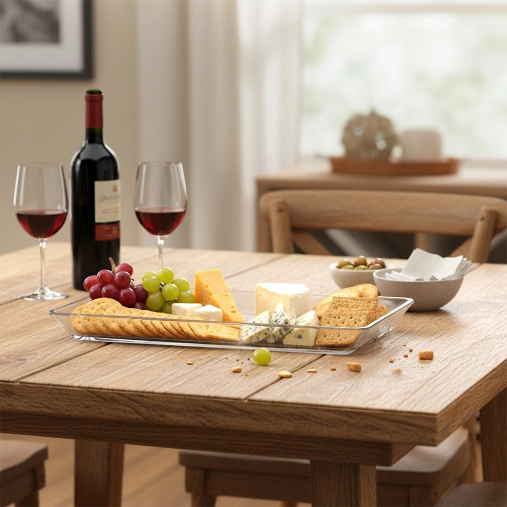 Transparentna izvedba ističe boje i strukturu jela, dok glatka površina stolu daje moderan izgled.