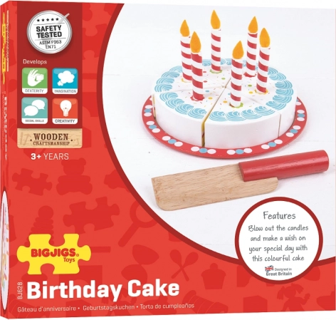 Otkrijte čaroliju slavlja s našom drvenom rođendanskom tortom za rezanje od Bigjigs Toys. Ova igračka idealna je za malu djecu koja uče o svijetu oko sebe kroz zabavne i interaktivne igre. Torta je dovoljno velika za igru šesteročlane družine i uključuje drveni nož za lako rezanje.