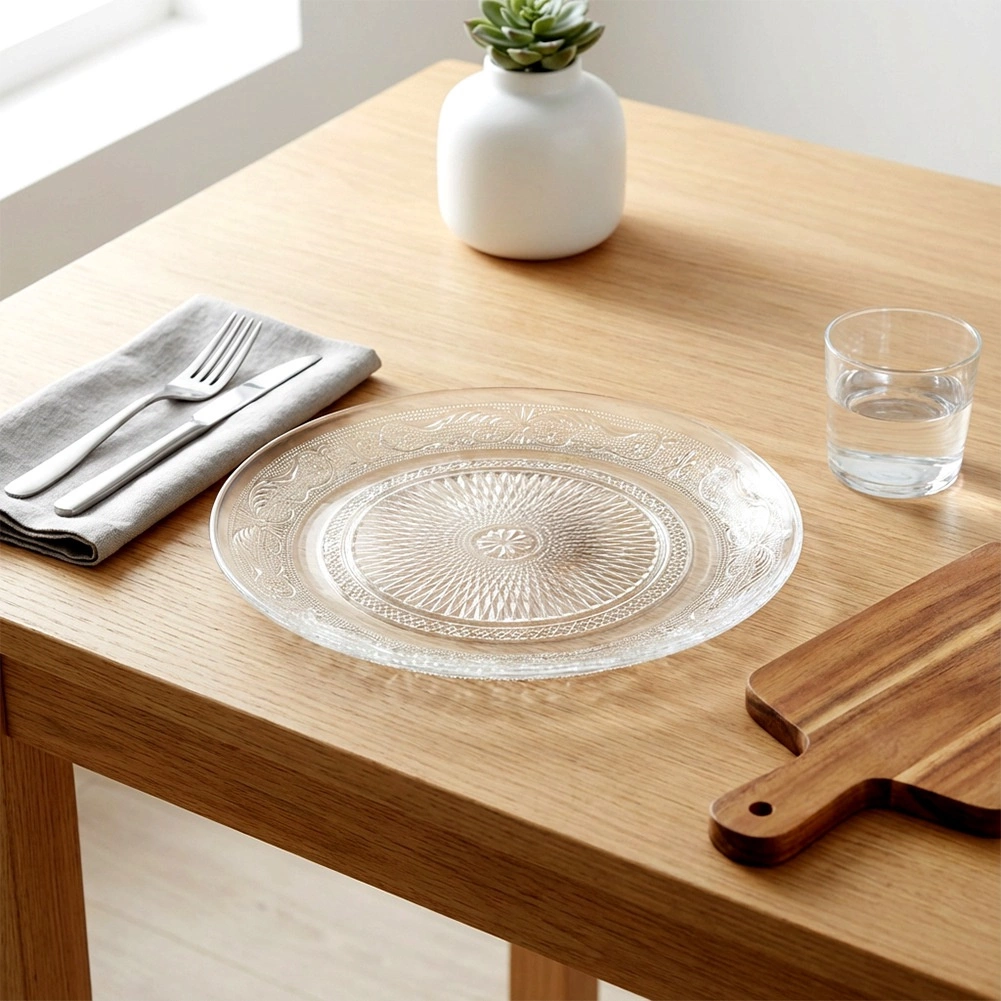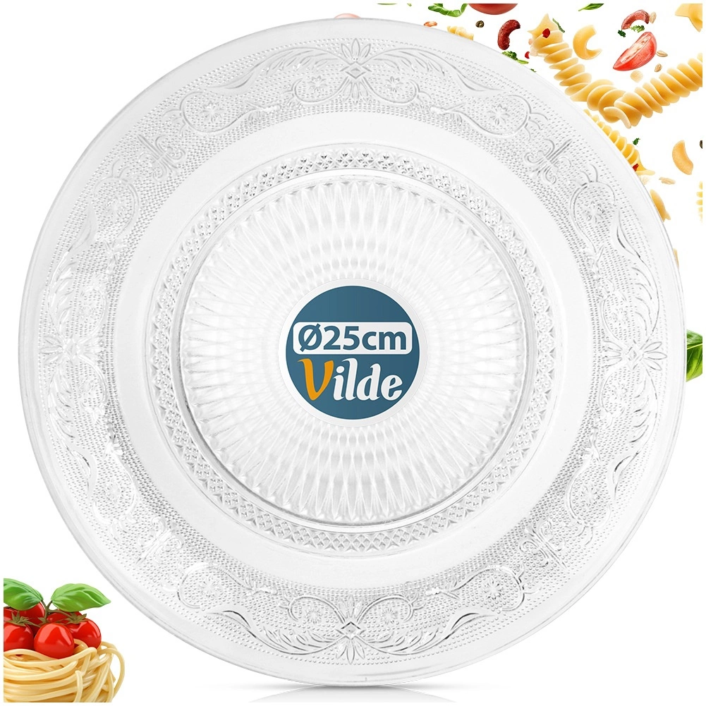 Elegantni stakleni tanjur promjera 25 cm s reljefnim ukrasom koji podsjeća na kristal. Svestran i praktičan za svakodnevno blagovanje i svečano posluživanje. Može se koristiti kao plitki tanjur ili kao poslužavnik za deserte i osvježenje. Pogodan za perilicu posuđa, kvalitetno prozirno staklo, klasičan dizajn i univerzalna primjena u kućanstvu i ugostiteljstvu.