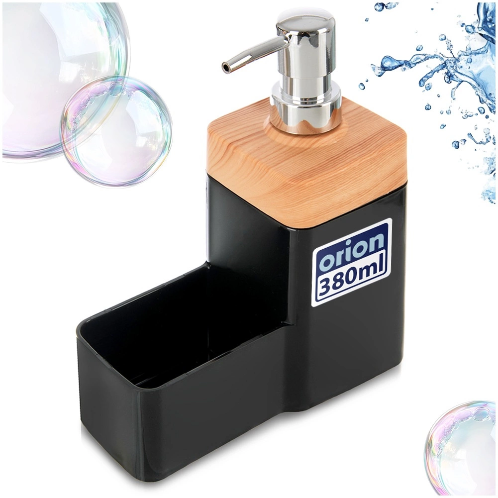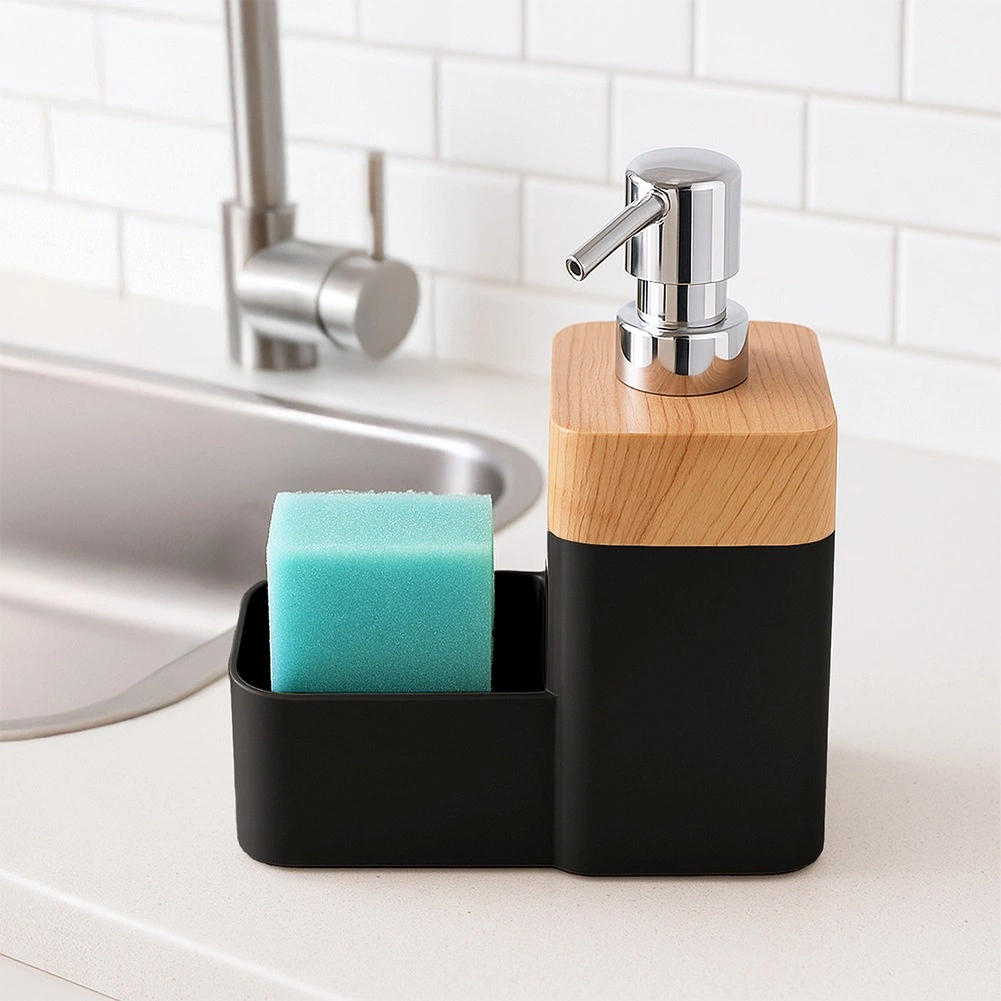 Praktični dozator deterdženta za posuđe s integriranim organizatorom za spužvicu održava red oko sudopera. Kombinira moderno crno izvedenje s drvenim dekorom, ima kapacitet 500 ml i protukliznu podlogu za stabilnost. Jednostavno nadopunjavanje i elegantan izgled pristaju svakoj kuhinji.