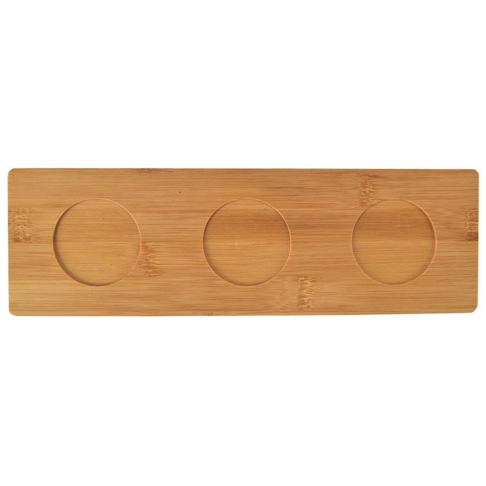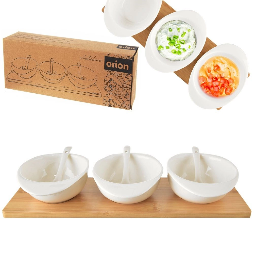 Elegantni set triju bijelih porculanskih zdjelica sa žličicama na čvrstoj bambusovoj pladnju za stilizirano posluživanje. Idealno za umake, preljeve, predjela i grickalice. Kvalitetan porculan i izdržljiv bambus osiguravaju dug vijek trajanja, izvadive zdjelice lako se prenose i peru. Prikladno za perilicu posuđa i mikrovalnu pećnicu.