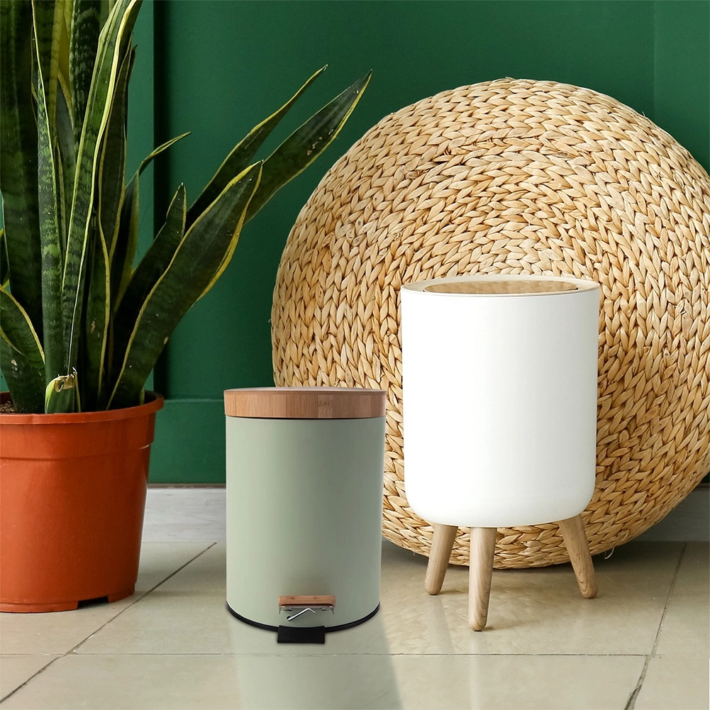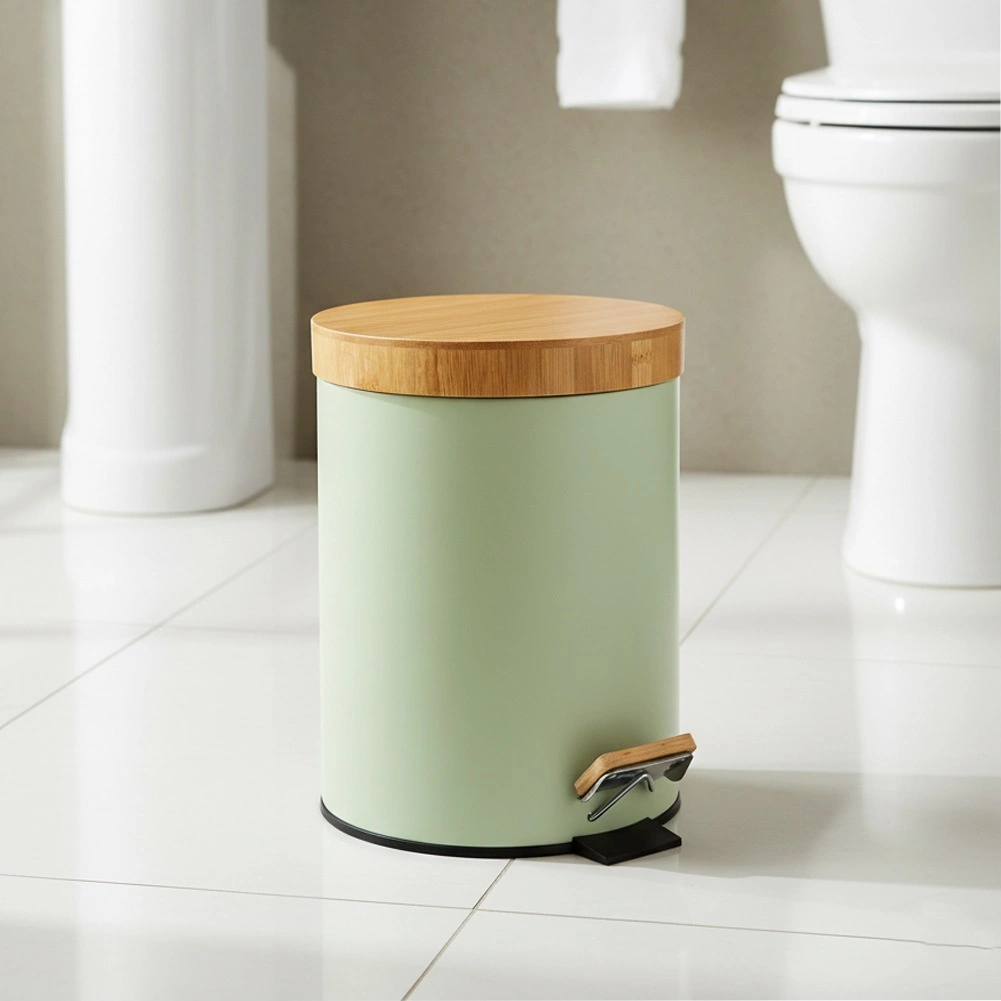 Kompaktna kanta za otpad zapremine 5 l u elegantnoj pastelnopj zelenoj boji kombinira metalno tijelo s bambusovim poklopcem i pedalom. Zahvaljujući higijenskom otvaranju pedalom bez dodira, izvadivoj unutarnjoj posudi i stabilnoj konstrukciji idealna je za kupaonicu, kuhinju, ured i spavaću sobu.