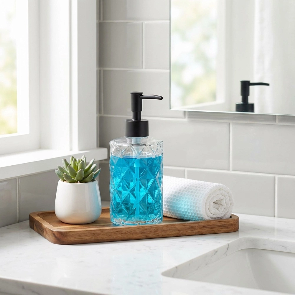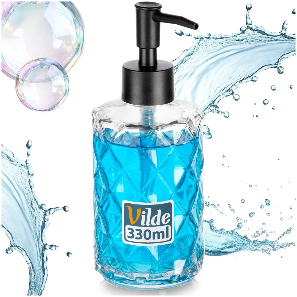 Stilski stakleni dozator za sapun zapremine 330 ml s crnom pumpicom i dekorativnim dijamantnim uzorkom prikladan je za kupaonicu i kuhinju. Prozirno staklo olakšava kontrolu količine punjenja, jednostavno nadopunjavanje štedi vrijeme, a moderan dizajn održava vaš prostor urednim i elegantnim.