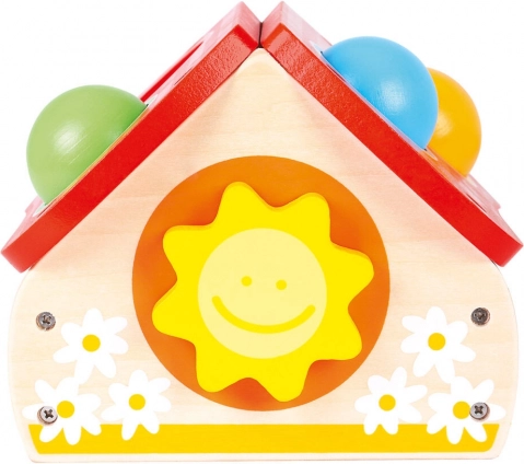 Ova kvalitetna drvena igračka u obliku vesele kućice privlači djecu živim bojama i jednostavnim principom igre – loptice se umeću u otvore na krovu i nježno zabijaju čekićem. Zabava potiče razvoj motorike, strpljenje i preciznost.