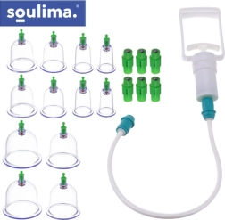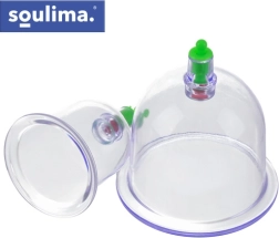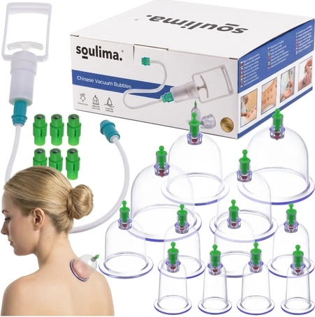 Set vakuumskih čašica SOULIMA praktično je rješenje za kućno vakuumiranje bez plamena. Zahvaljujući ručnoj pumpici lako podesite podtlak, što osigurava sigurniju i precizniju terapiju. Različite veličine čašica omogućuju tretiranje većih mišićnih skupina kao i manjih, osjetljivijih područja. Magnetski nastavci podupiru ciljanu stimulaciju akupresurnih točaka.